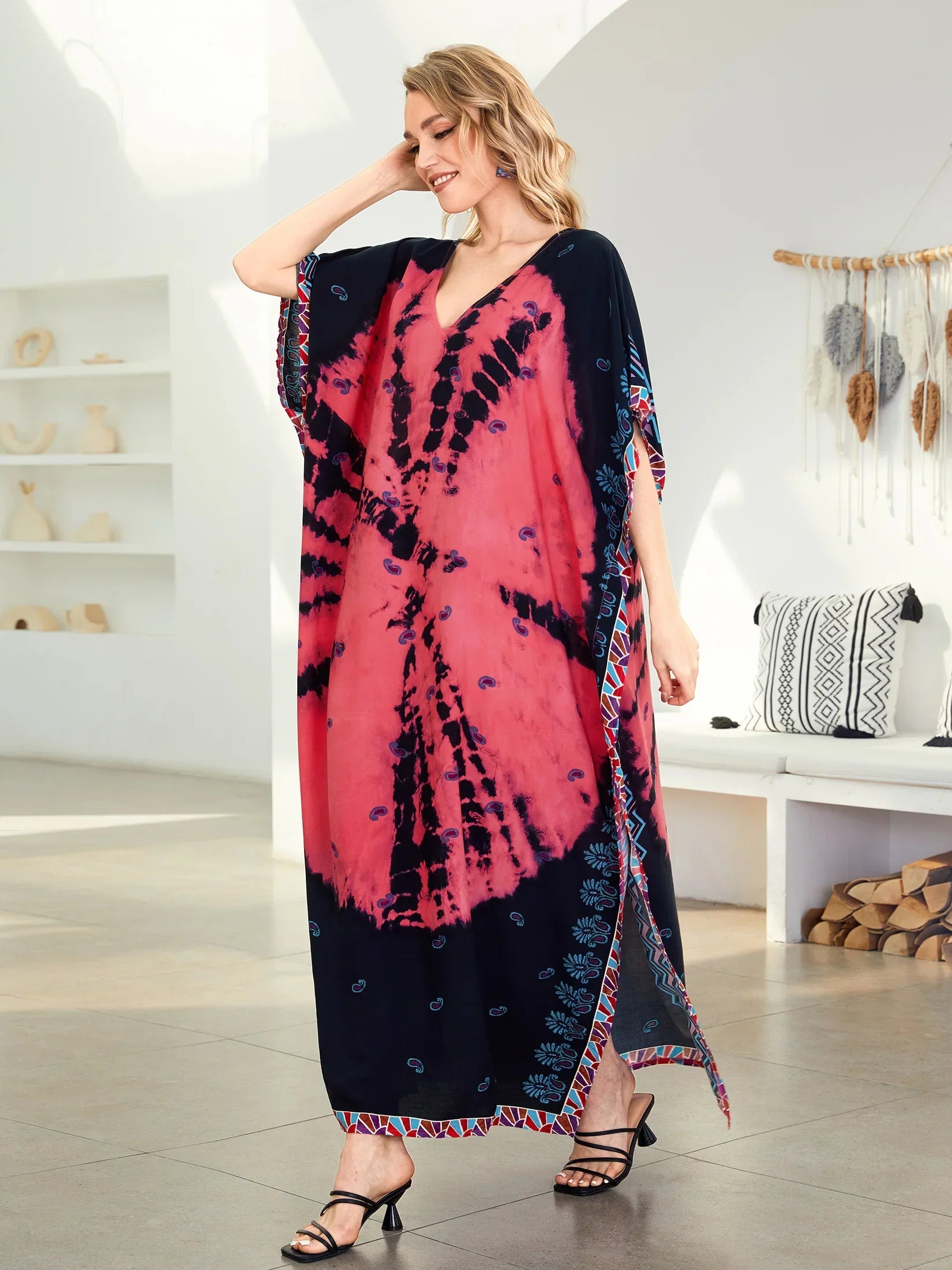 Indulge in the vibrant and free-spirited style of our Bohemian Red Printed Loose Kaftan! This tye-dye kaftan exudes an ethnic flair that adds a touch of boho-chic to any outfit. With its fashionable design, dress it up with boots for a unique and stylish look. Please allow up to two weeks for delivery.