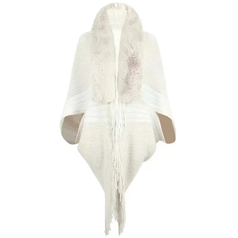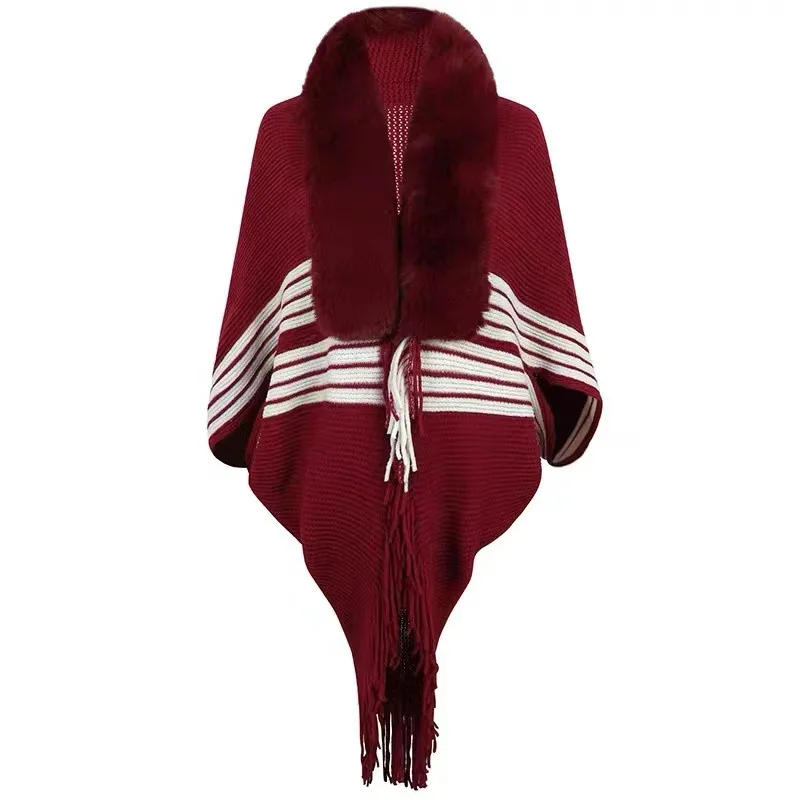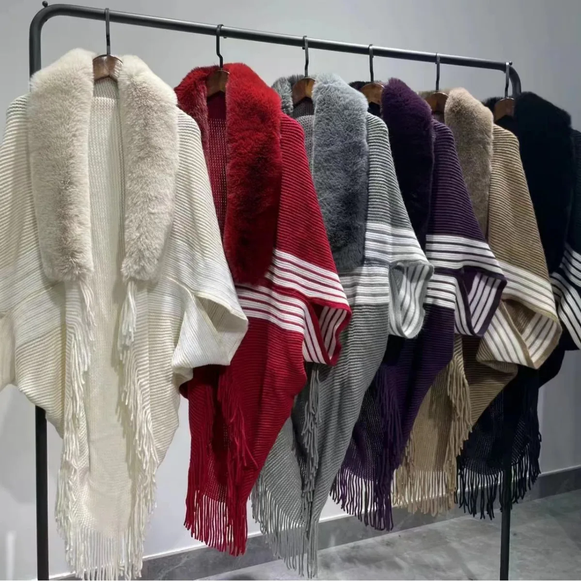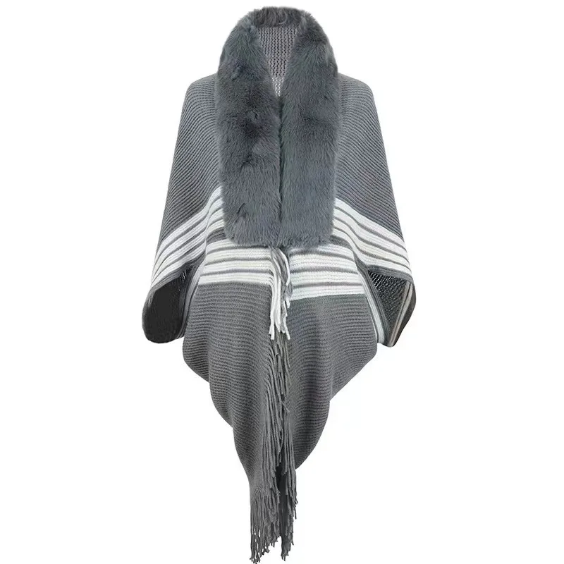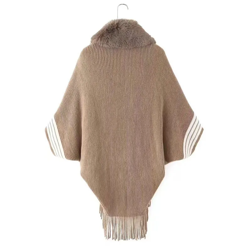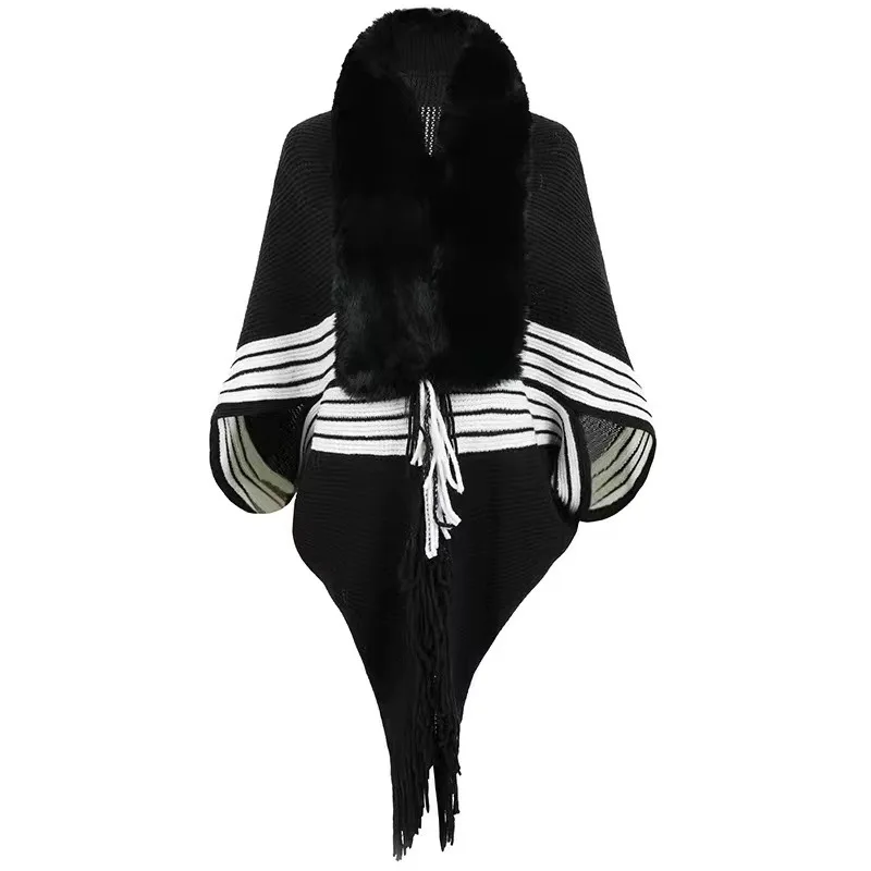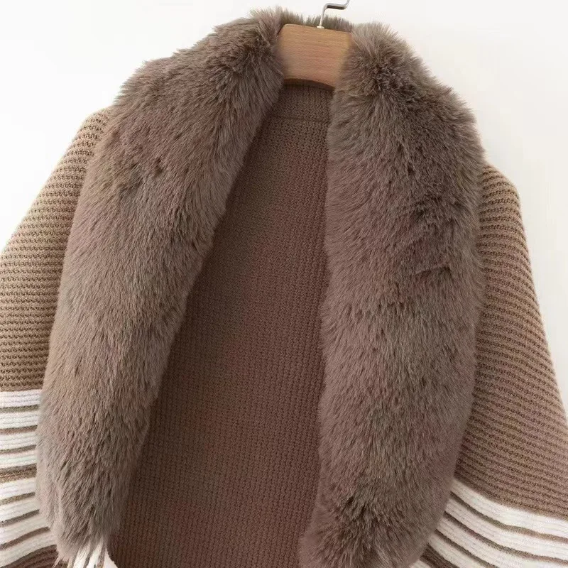 2024 Faux Fur Neck Winter Loose Cardigan Cape Sweater Striped Tassel Poncho Cloak Women Knitted Batwing Sleeves Long Knitwear