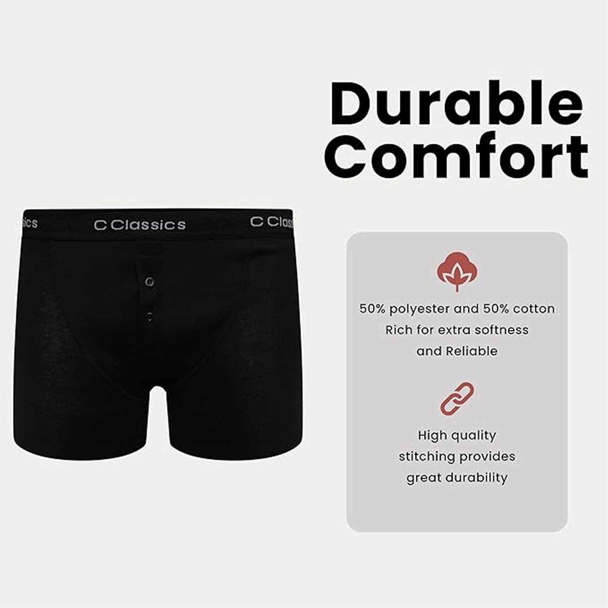 Introducing our 6 Pairs Of Kids Black Cotton Rich Boxer Shorts with Button Fly, designed with both comfort and durability in mind. These classic boys' boxer underwear are crafted from breathable and stretchable material, making them perfect for active children. Say goodbye to discomfort and hello to uninterrupted coolness with our premium boxer shorts collection.