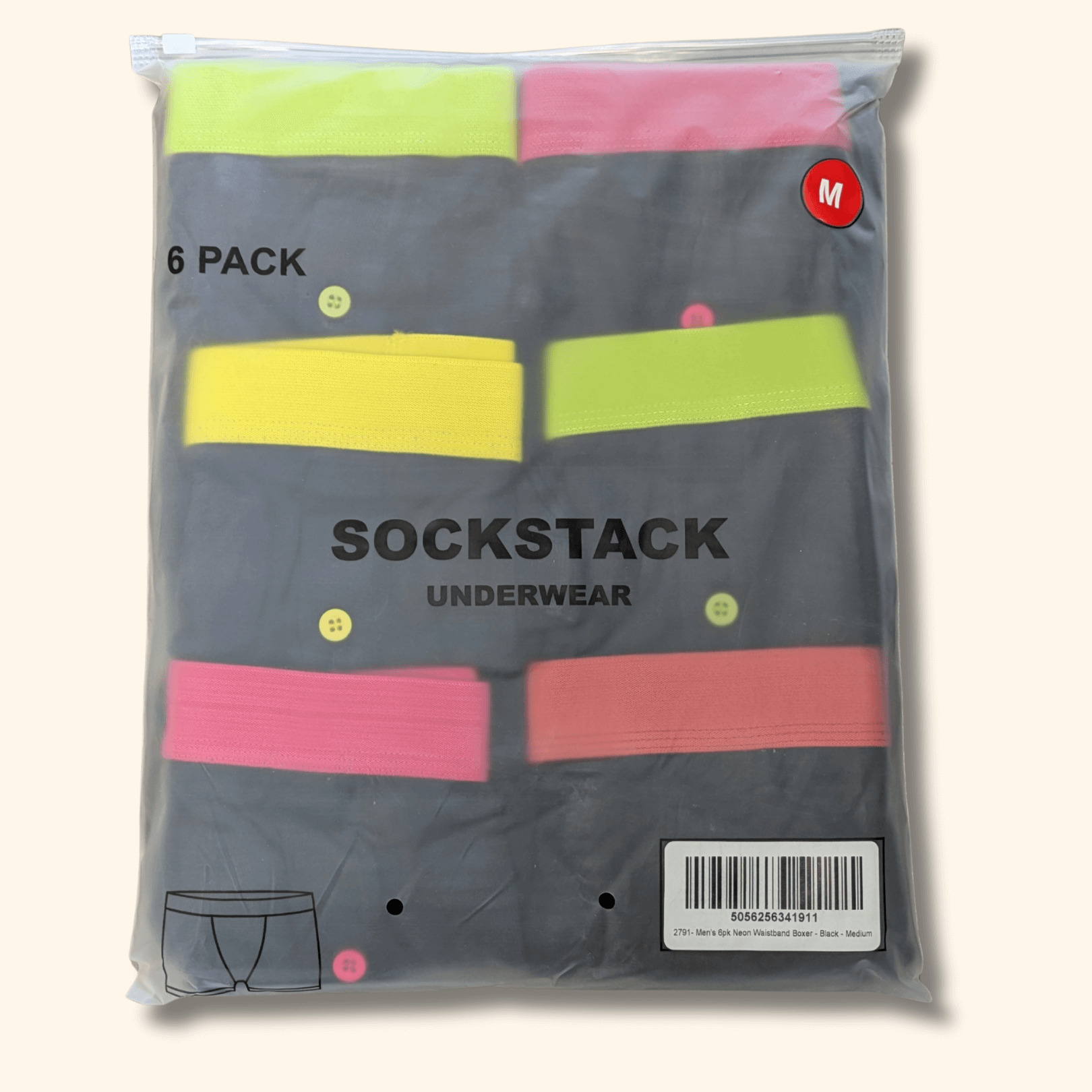 6 Pack Classic Menswear Black Cotton Blend Boxer Shorts Breathable Activewear Comfortable Stretch Colourful Waistband Durable Lightweight Button Fly Underwear MB08 by Sock Stack
