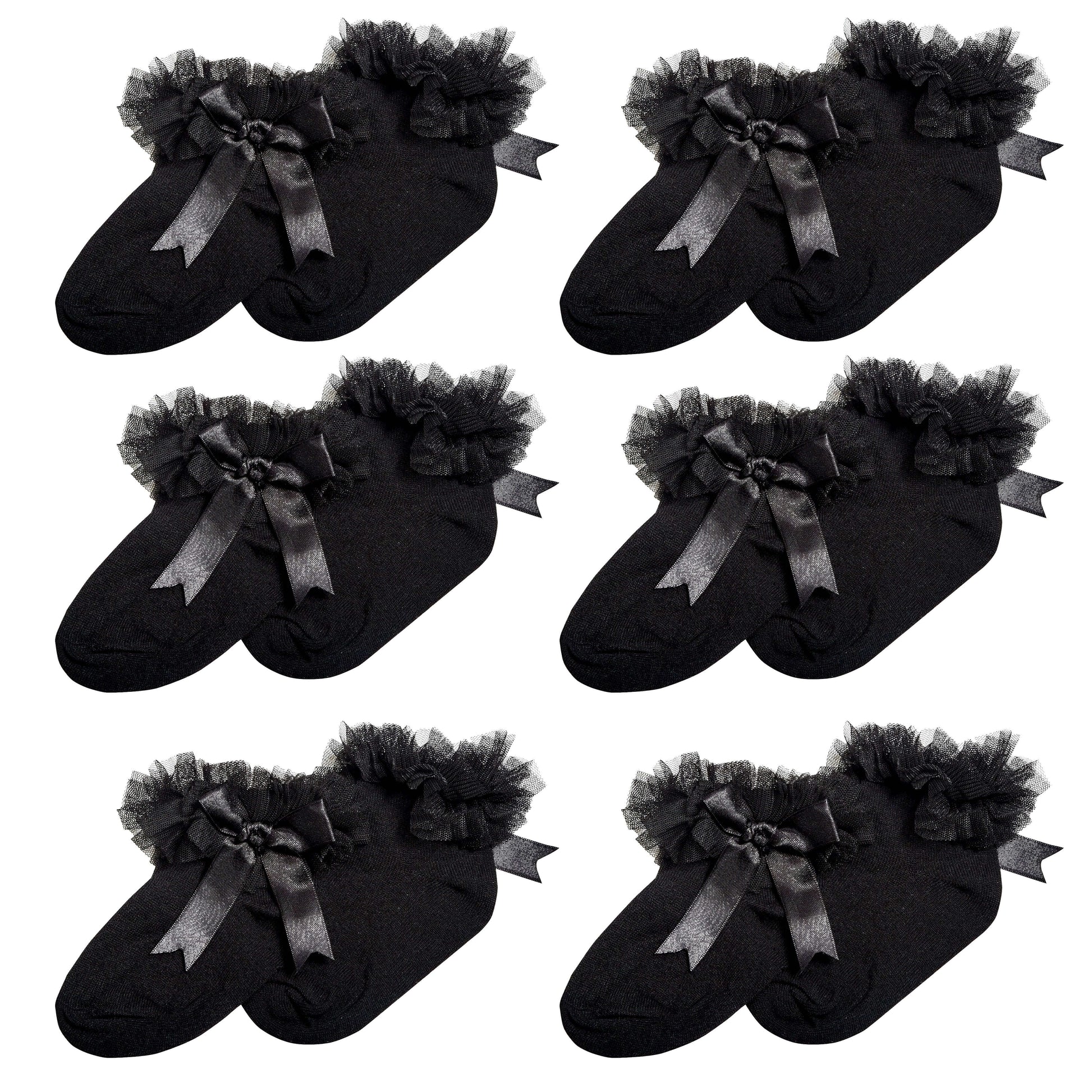 6 Pairs Black Girls Tutu Frilly Ankle Socks with Lace & Bow Super Soft Wedding Christening Sock by Sock Stack
