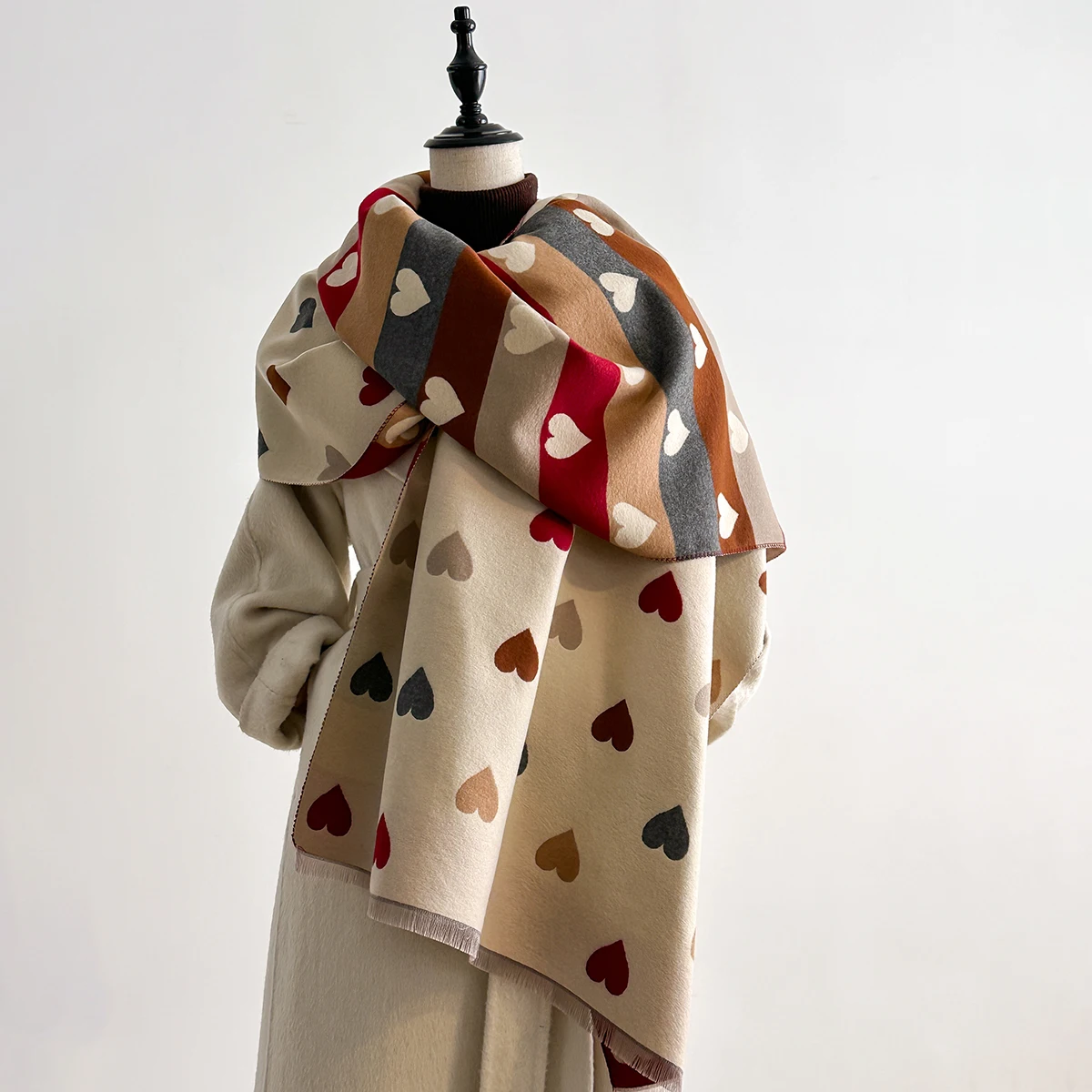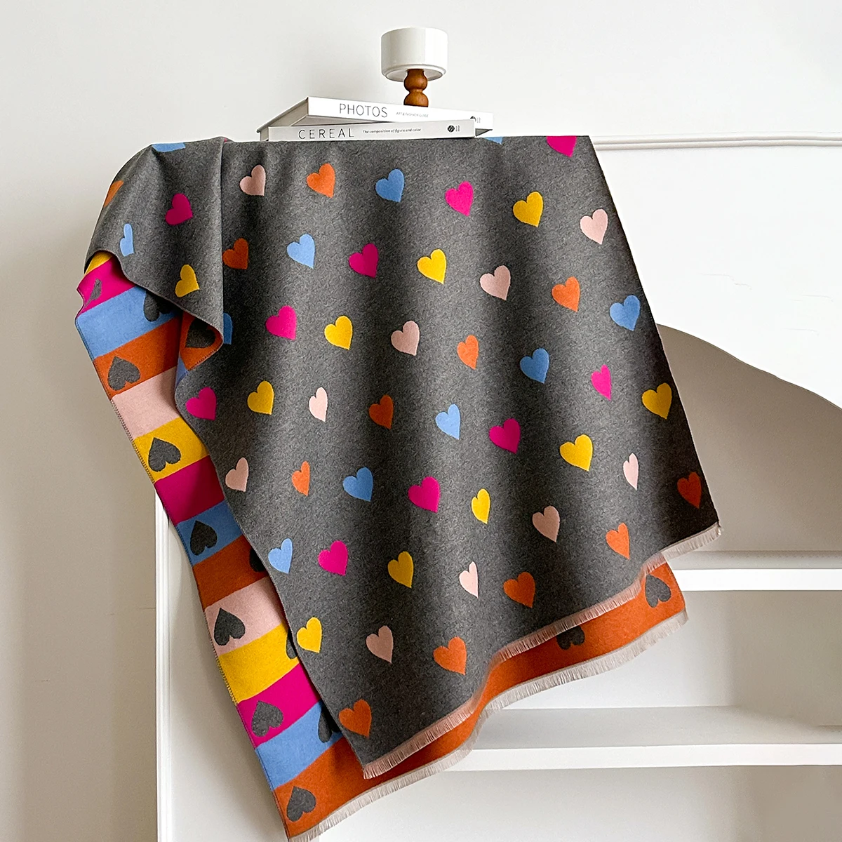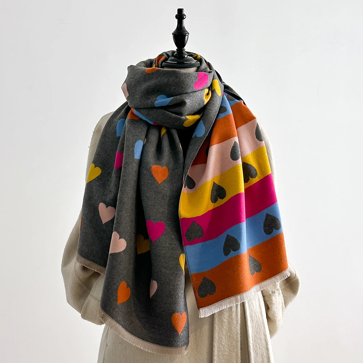 Autumn Winter Retro Imitaion Cashmere Shawl Fashion Woman Versatile Heart Double-sided Color Matching Pashmina Thick Warm Scarf