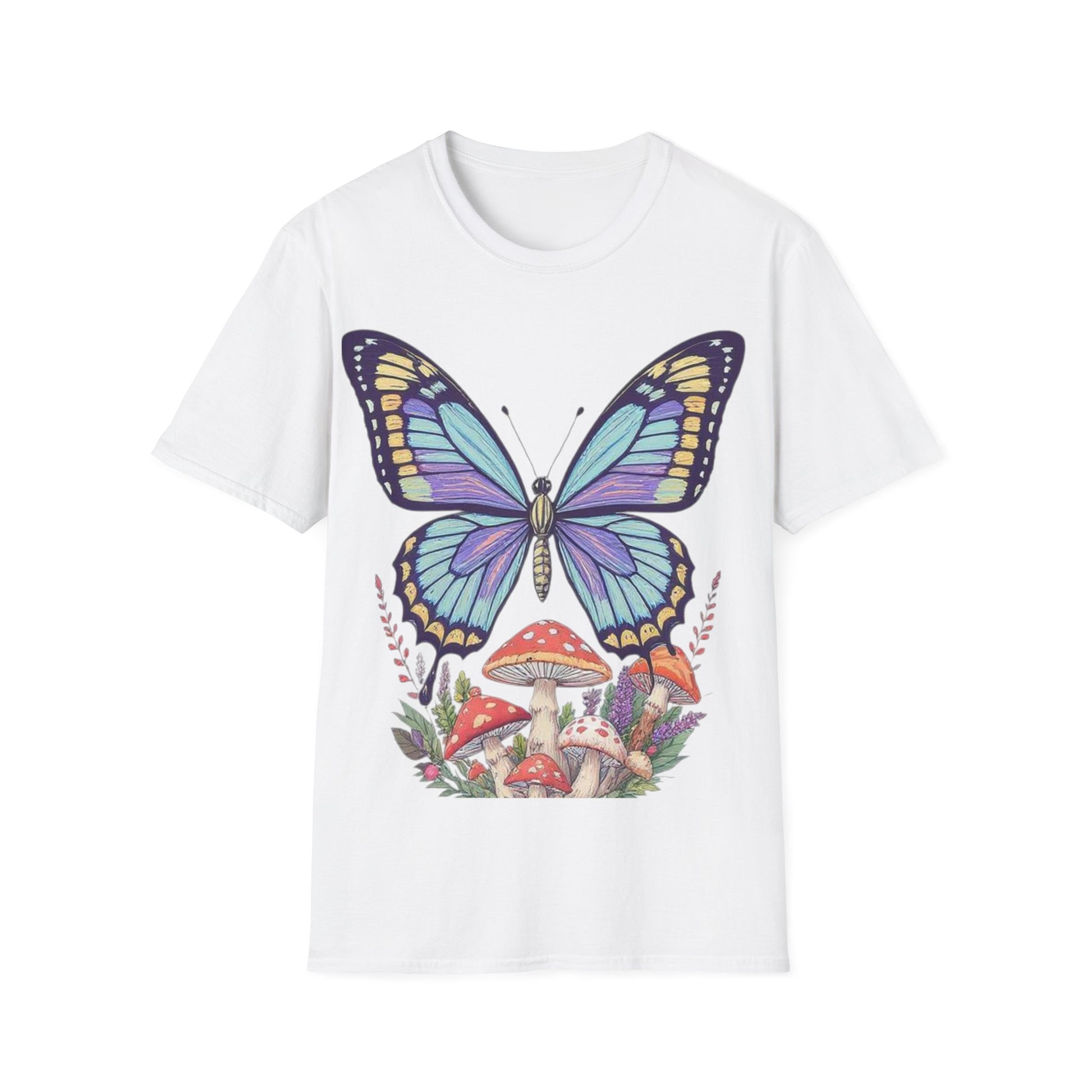 Elevate your casual wardrobe with this beautiful unisex softstyle t-shirt that blends comfort with eye-catching design. Featuring a stunning butterfly and mushroom graphic, this t-shirt is perfect for nature lovers and anyone who enjoys vibrant, artistic prints. The lightweight fabric makes it a joy to wear year-round, whether you're lounging at home, going out with friends, or attending a casual gathering. Suitable for adults, this shirt can be an excellent choice for birthdays, summer festivals, or just a thoughtful gift for a loved one who appreciates unique fashion. Embrace your style with this versatile tee that effortlessly transitions from day to night.