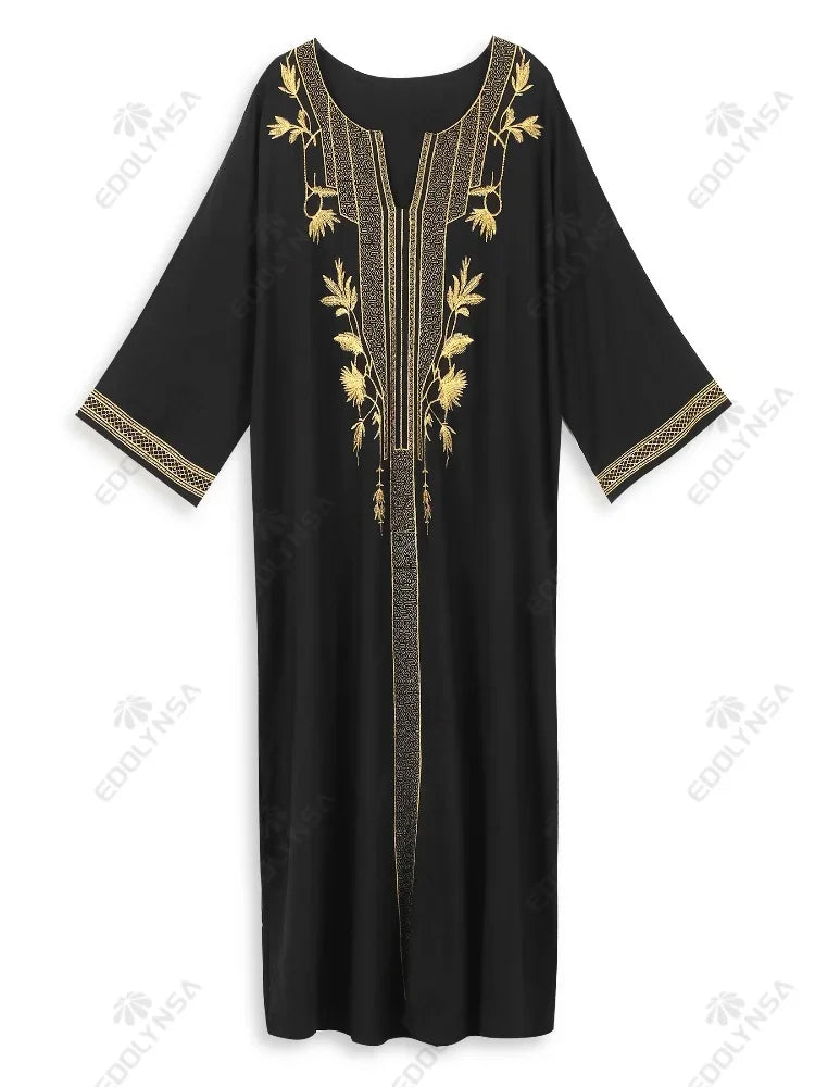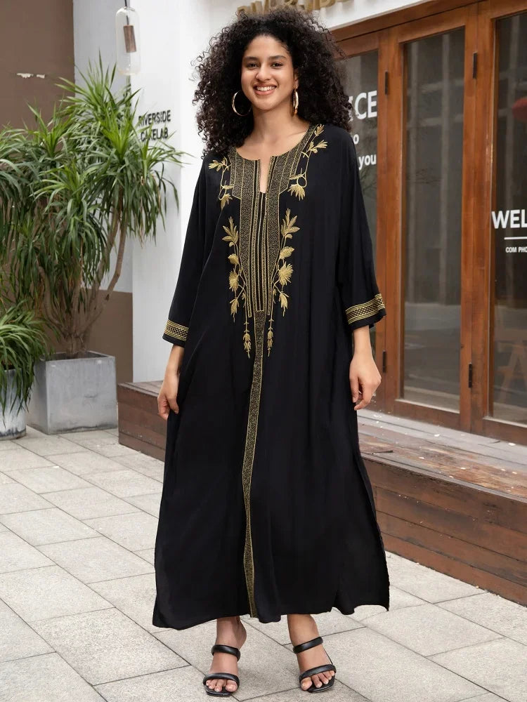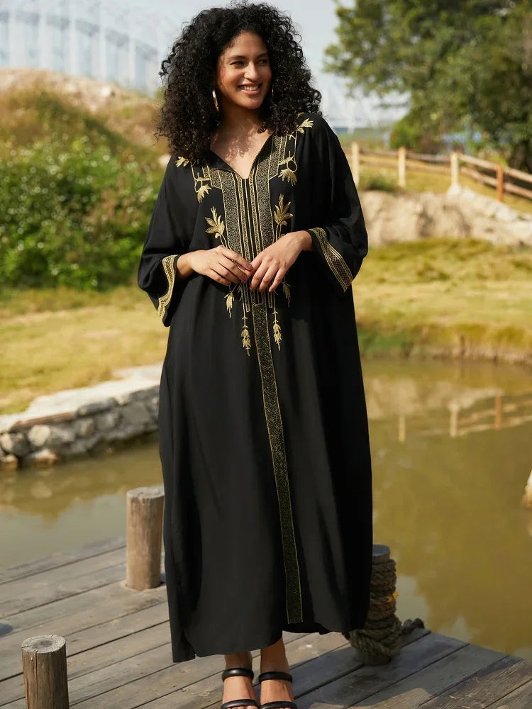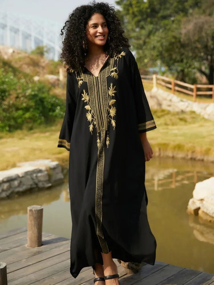 Bohomian Golden Embroidered Women Printed Kaftan House Robe Oversized 2024 Summer Women Beach Wear Lounge Maxi Dresses Q1659