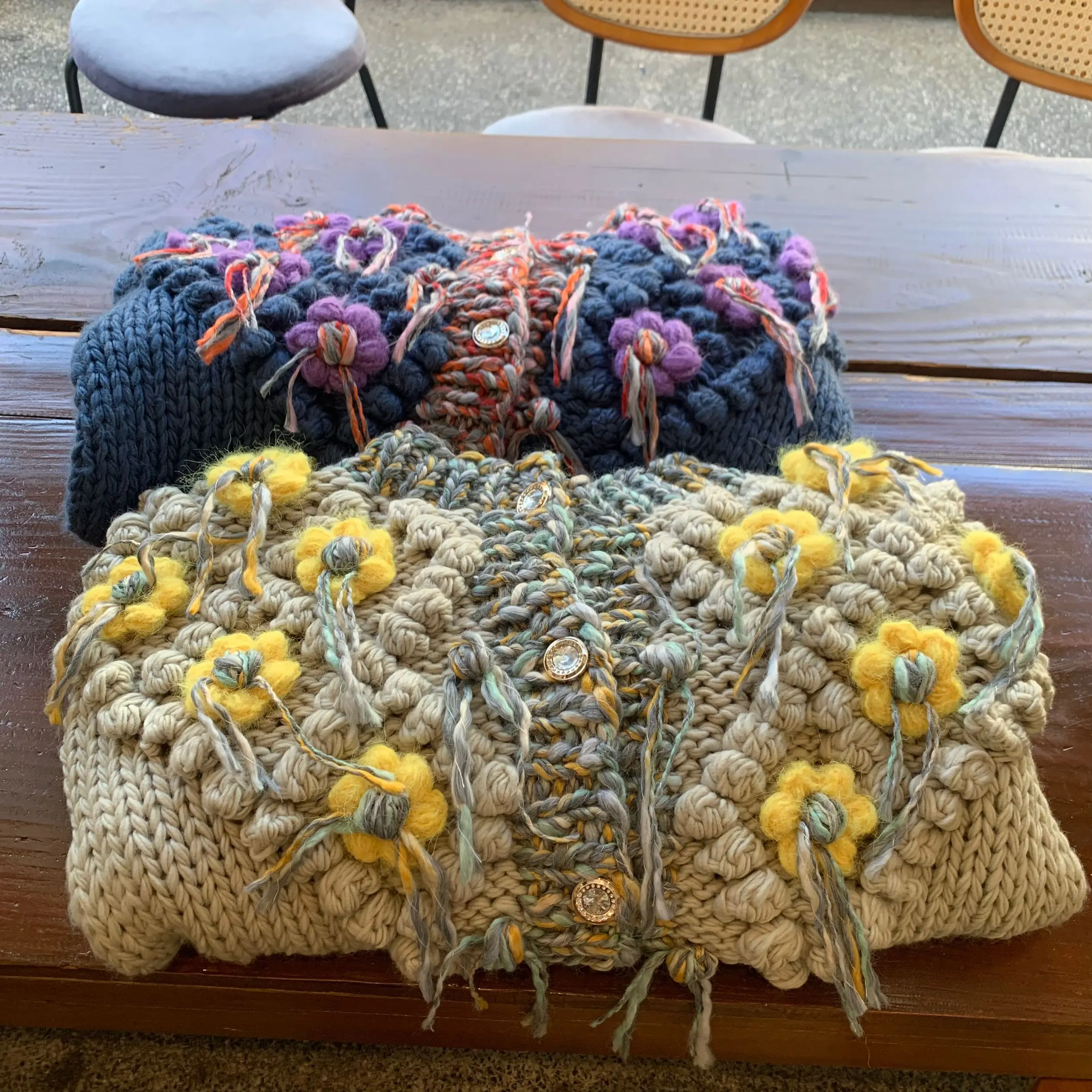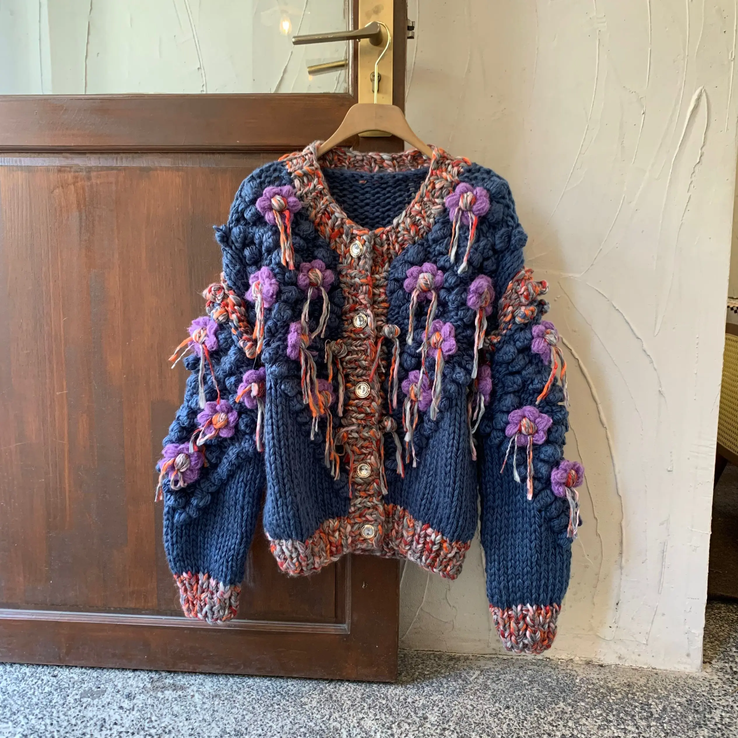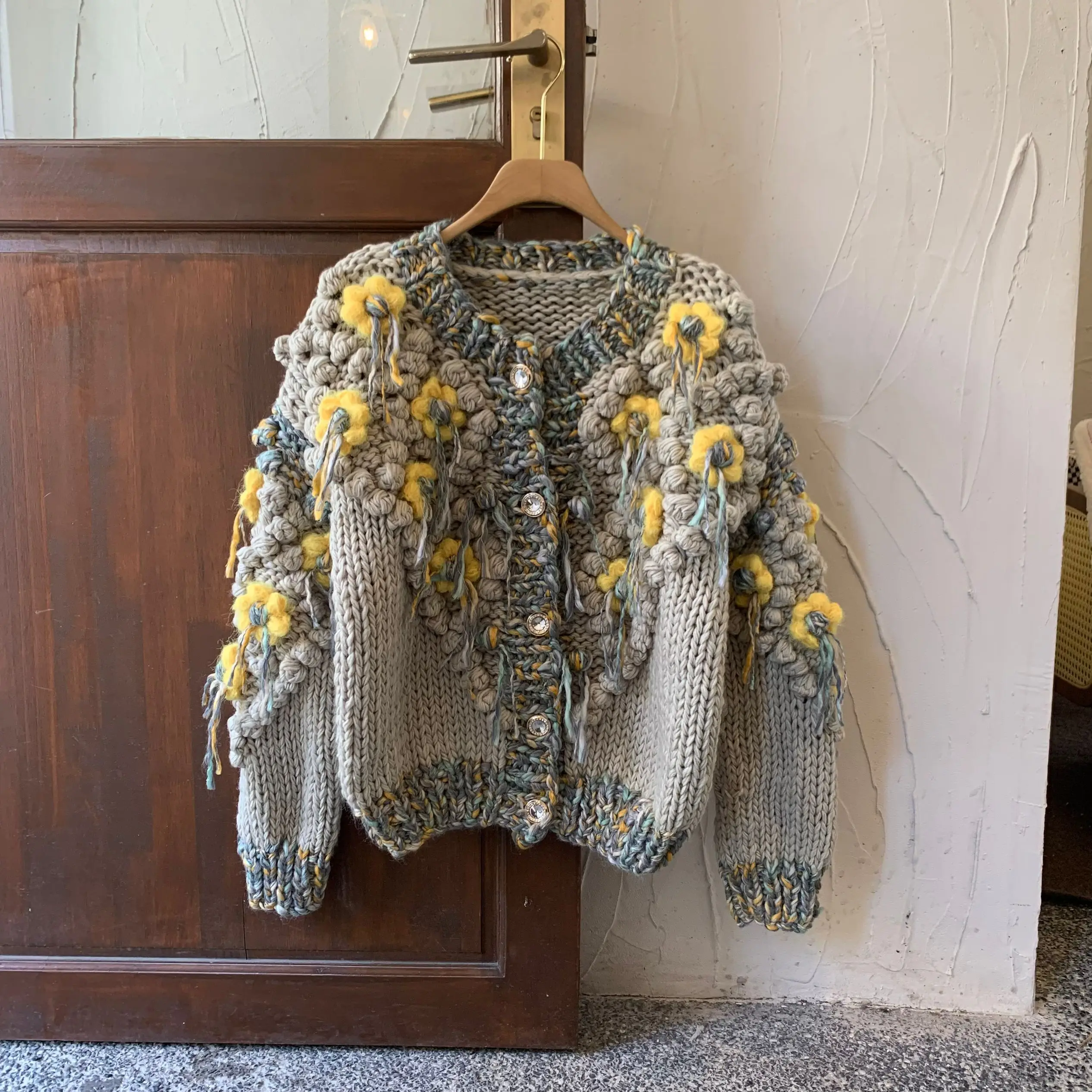 Chunky Flower Knitted Cardigan Women 2024 Warm Handmade Knit Coat NIche Design Autumn Winter Outfit Sweater