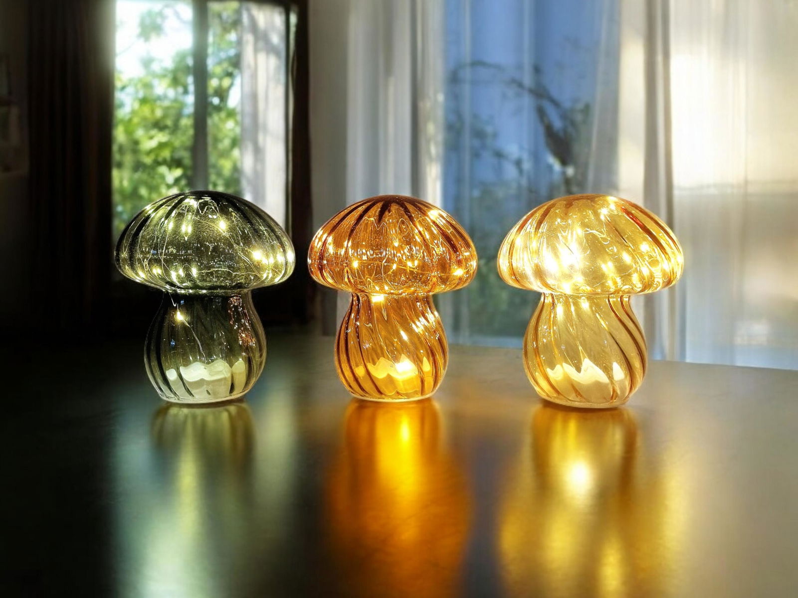 Coloured Glass Mushroom L.E.D Light Set of 3 G/O/Y