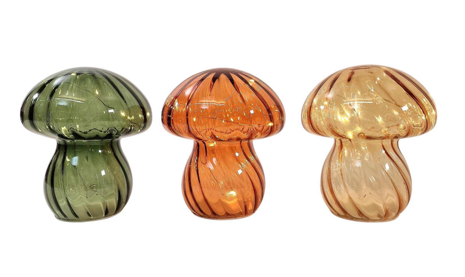 Brighten up your decor with this enchanting set of three LED-lit glass mushroom ornaments, each crafted with vibrant green, yellow and orange colours giving a whimsical charm. The soft LED lights add a warm, inviting ambiance, perfect for enhancing any tabletop, shelf, or windowsill. Each individual mushroom is 15cm tall with a 15cm diameter. Measurements: D16 x H13 x W13cm
