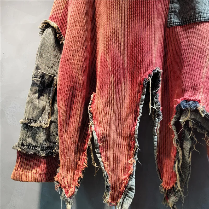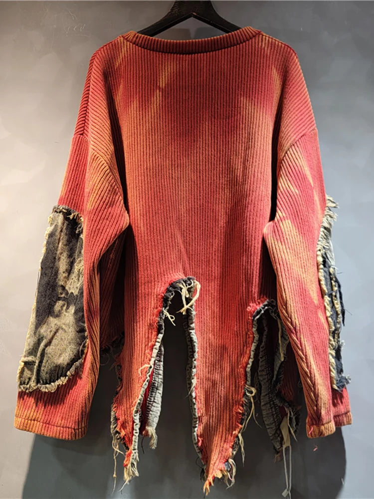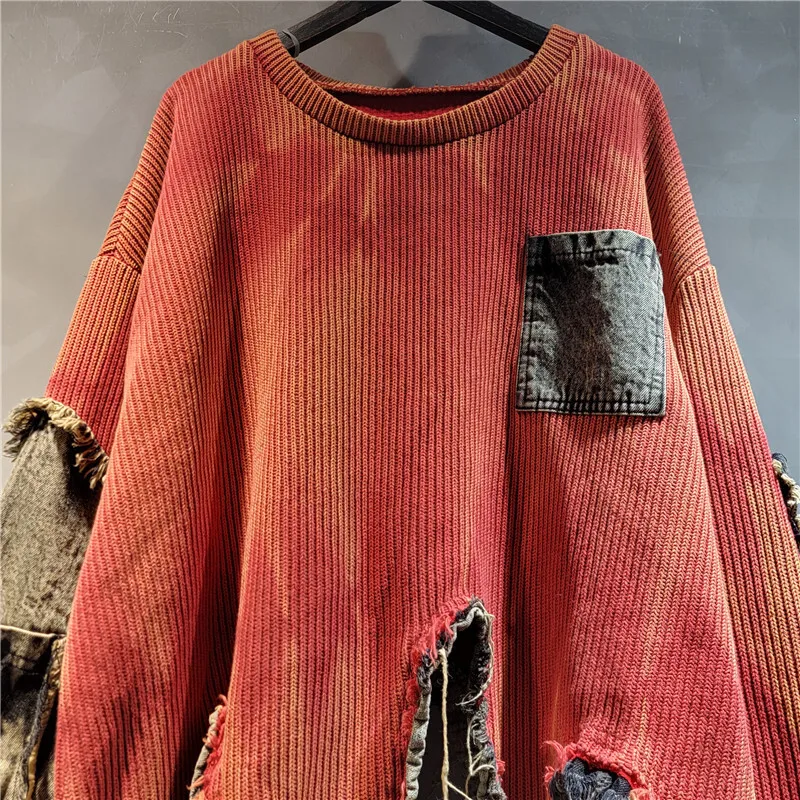 DEAT Women's Pullover Long Sleeve Tie-dye Irregular Do Old Patchwork Vintage Loose Denim Sweater 2024 Autumn New Fashion 29L8194