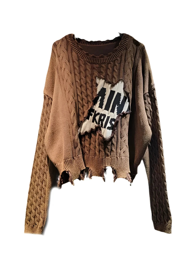 Women's Sweater Loose Patchwork Letters Distressed Long Sleeve Knitted Tassel jumper