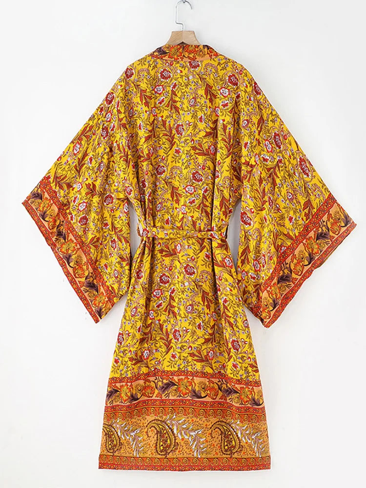 Fitshinling Bohemian Summer Beach Kimono Women Clothing Print Floral Holiday Bikini Cover Up Swimwear Cotton Vintage Cardigan