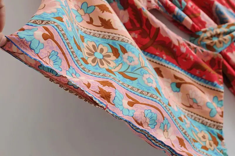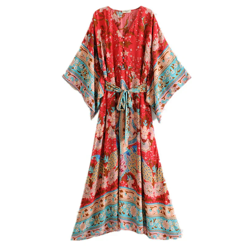 Happie Queens Women Red Floral Print Bat Sleeve Beach Bohemian Kimono