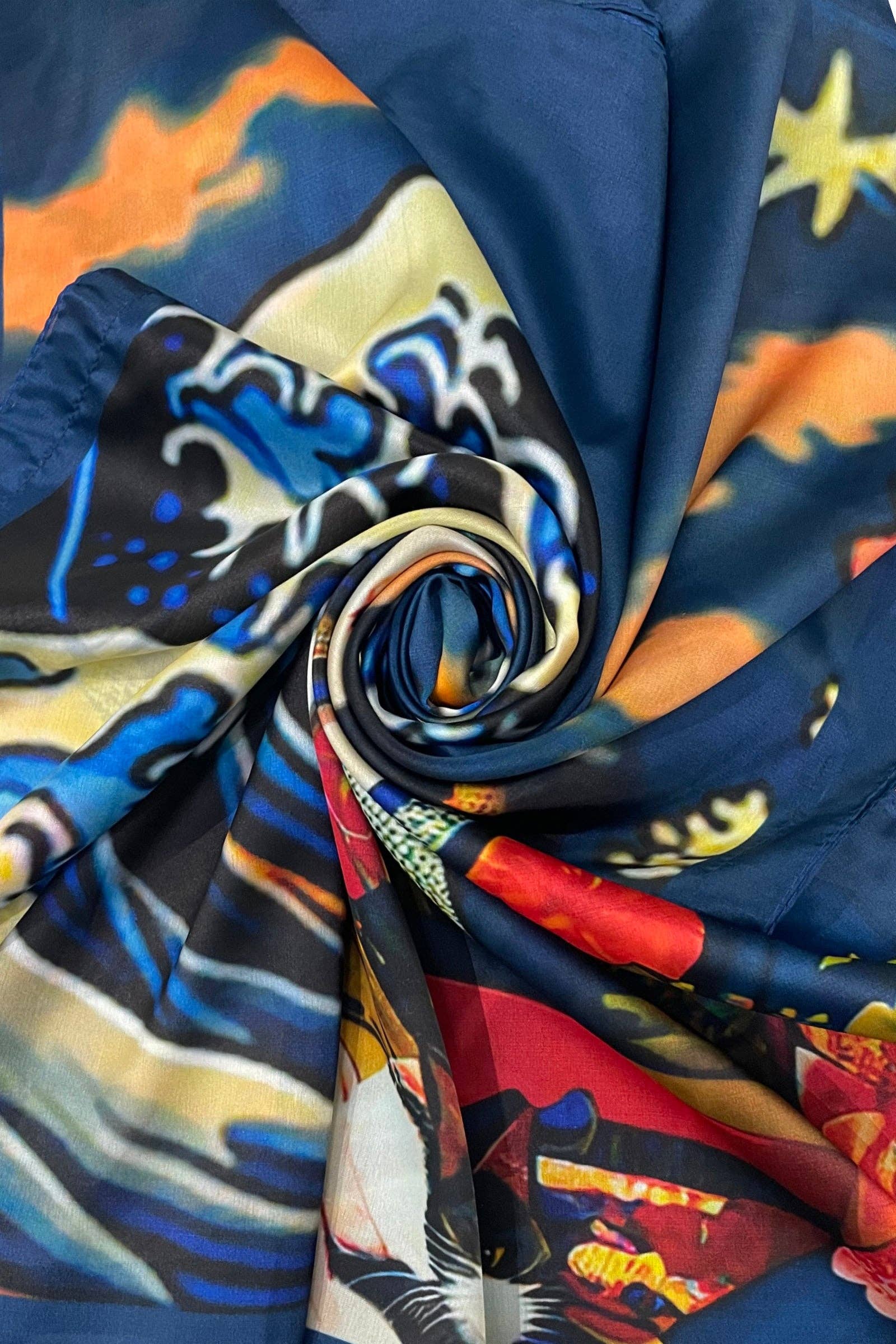 * Size: One Size * Material: 50% Silk 50% Viscose * Japanese Great Wave And Lady Print. * Vibrant Design. * Summer Cover Up Style. * Shop our Japanese Ukiyo-e Collection. * Match with our Scarf: SC-7641-A and our Cotton Tote Bag: BA-7751-A.