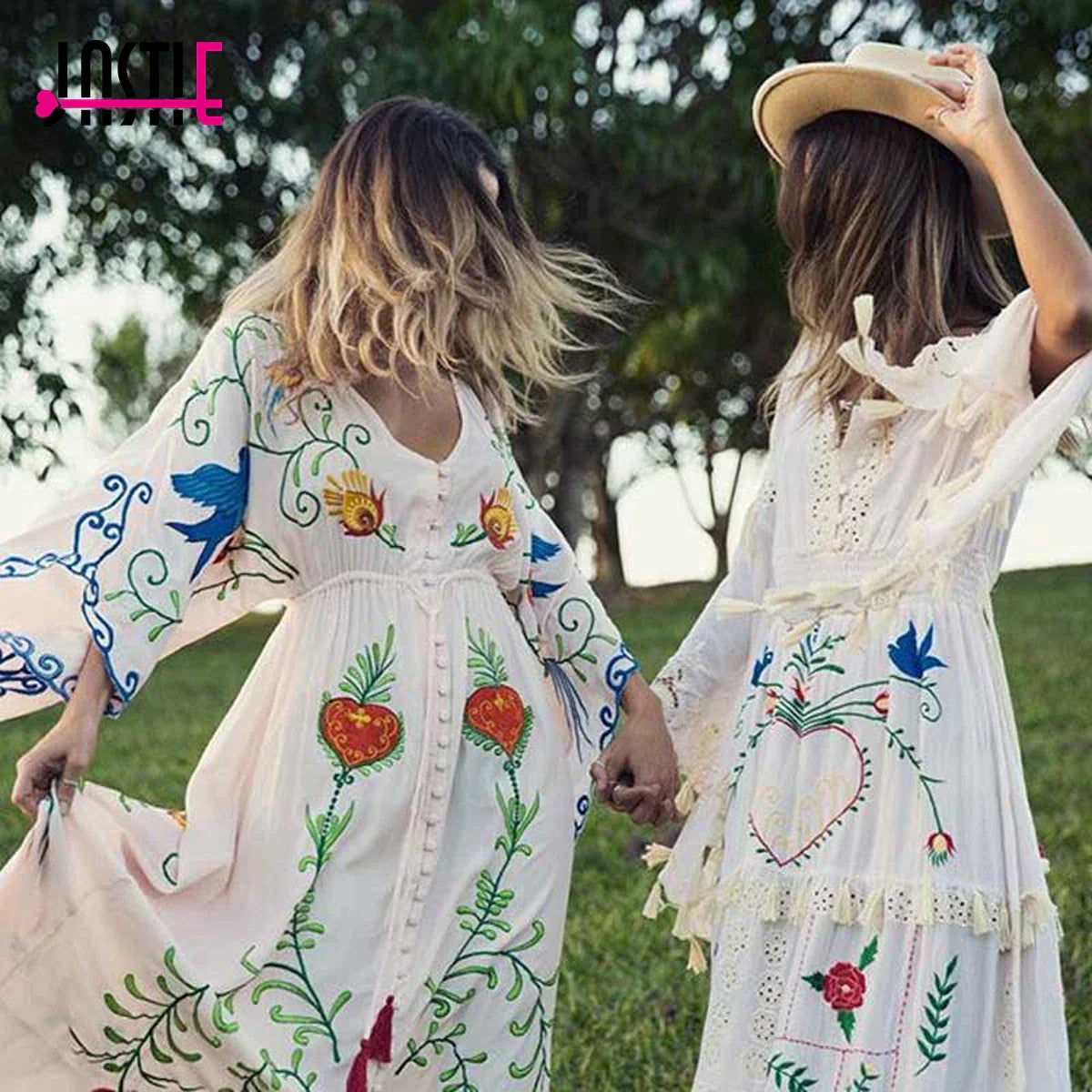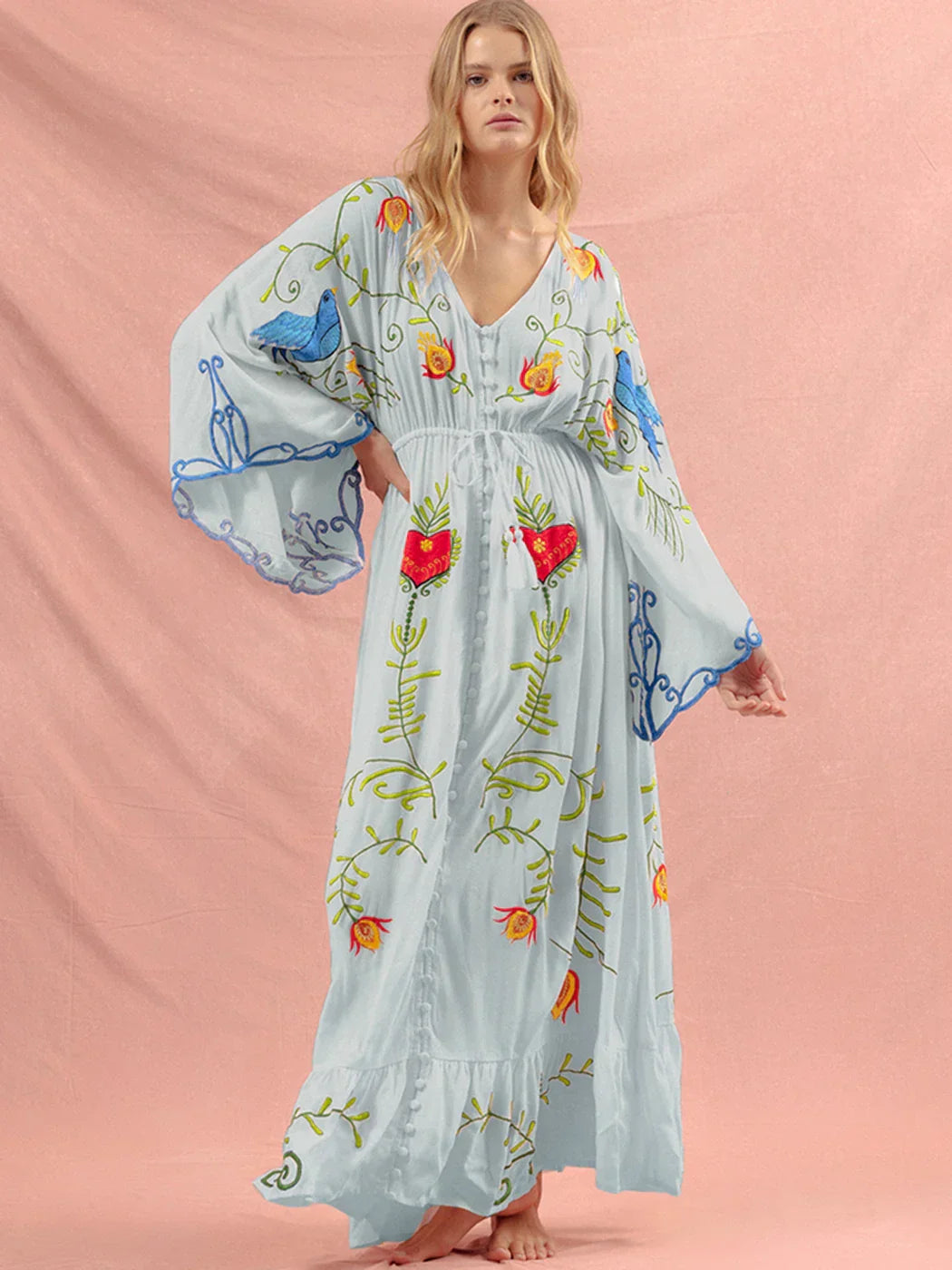 Jastie Embroidered Women Maxi Dress V-Neck Batwing Sleeve Loose Oversize Summer Dresses Drawstring Waist Boho Beach Vestidos