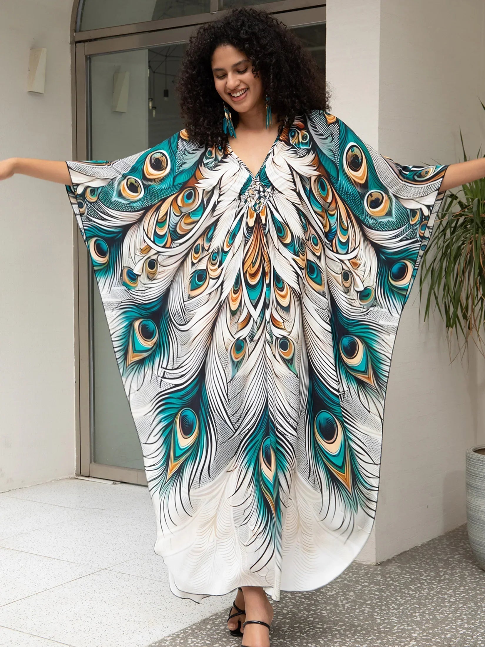 Experience the perfect blend of style and comfort with our beautiful Kaftan Dress For Women. This colorful and sexy dress features a flattering V-neck, batwing sleeves, and a loose, flowing fit perfect for any vacation. Available in plus sizes, this is the must-have piece for your summer 2024 wardrobe!