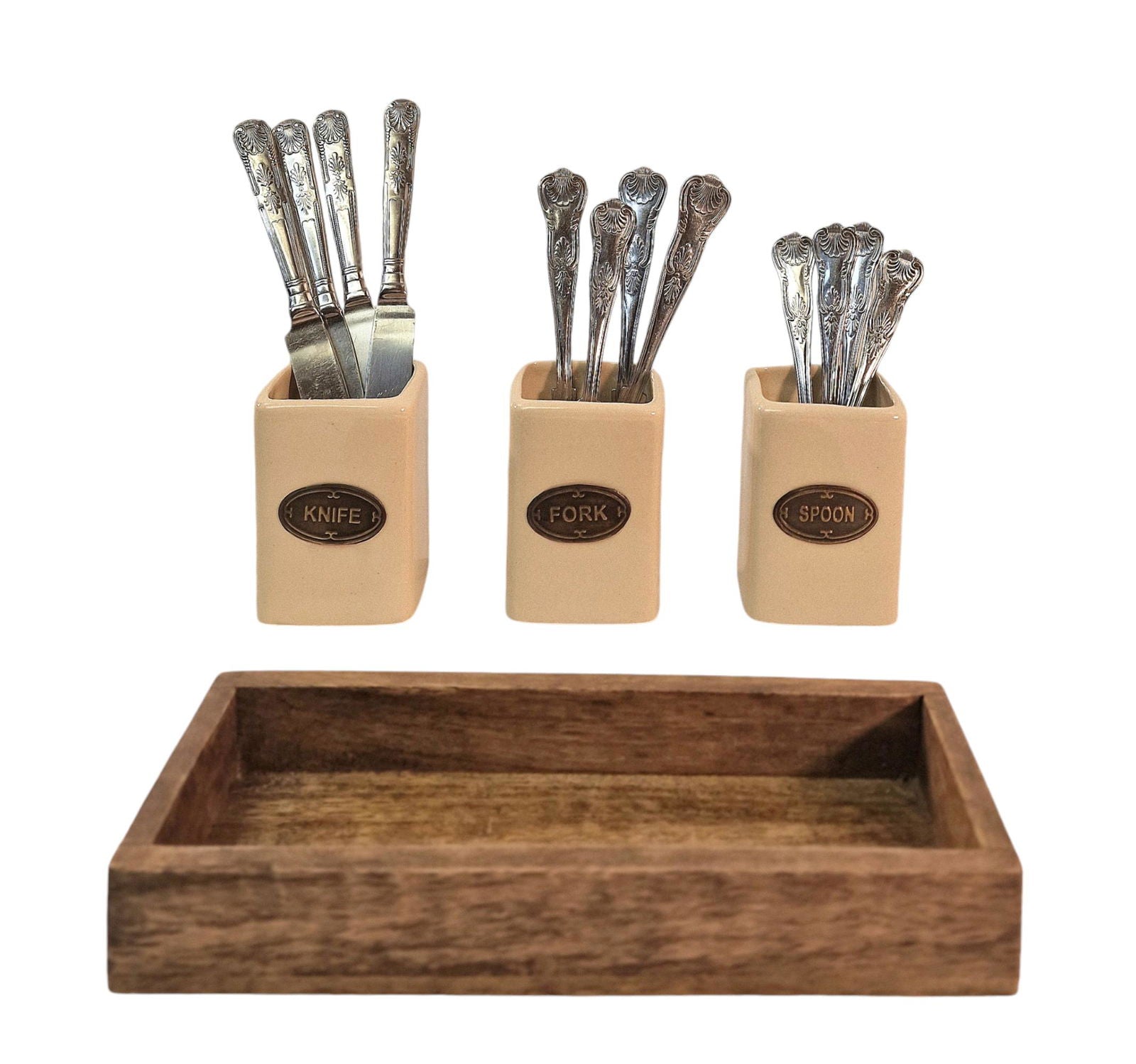 Knife, Fork & Spoon Ceramic Holder Set, with Mango Wood Tray