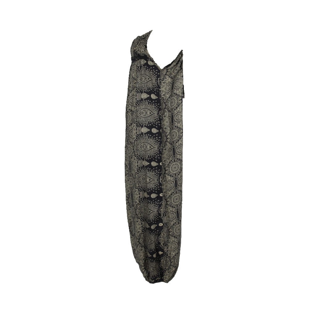 Choose from deep navy blue or dramatic black and love the feel of this soft and floaty jumpsuit with gathered ankles. The pretty, unusual tie-back shoulder cord gives you a really versatile fit and there are two handy side pockets. Beautiful patterned fabric makes them even more special, smothered in complex mandala designs. The flowing outline looks lovely. You can wear it on its own or over a long sleeve top, vest or T. Have a look in our hippy tops collection, see what you fancy.