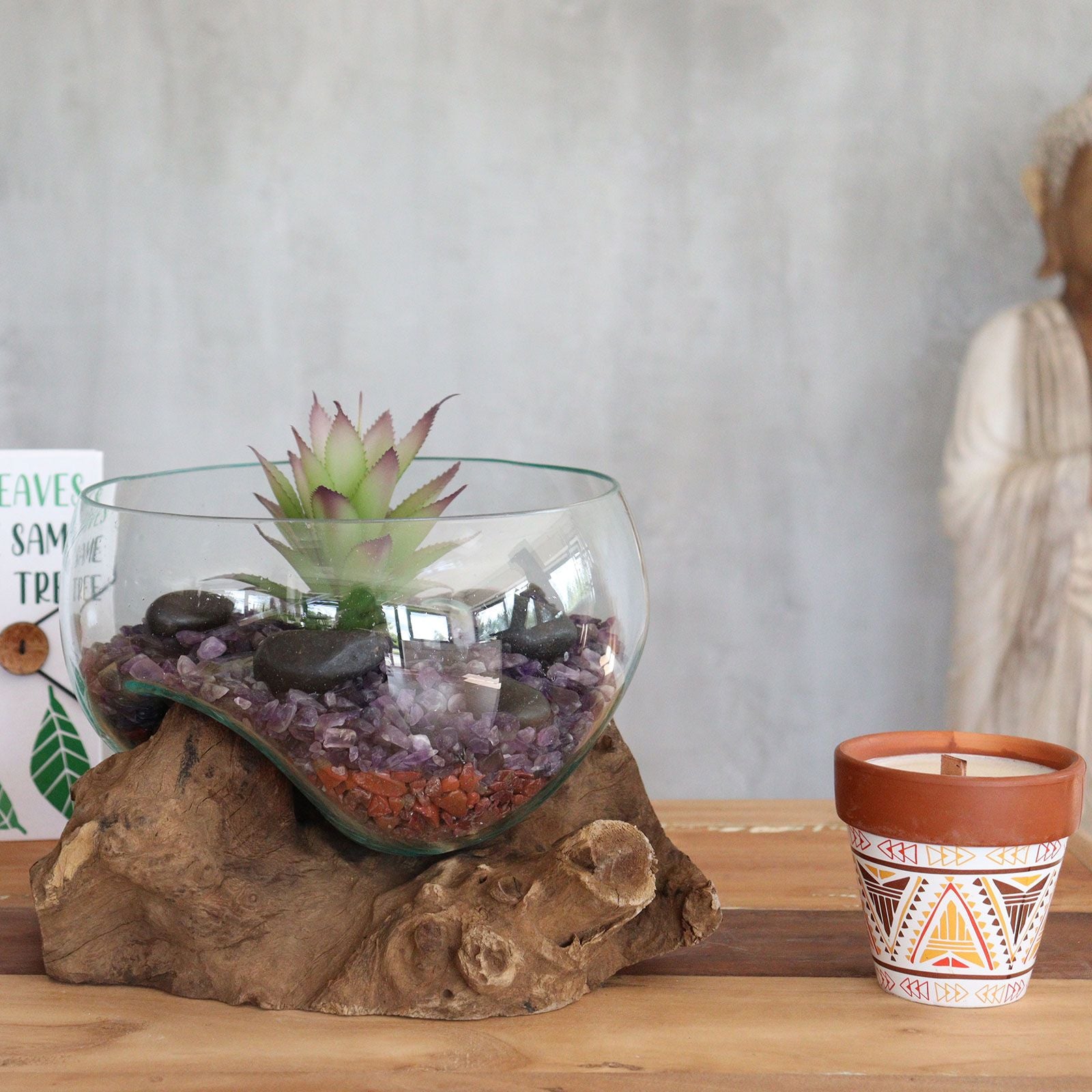 The glass is hand-blown and while still hot it is then relaxed over a piece of Gamal root, the glass then hardens to the shape of the wood ensuring a perfect fit. They are crafted using a natural product by using hand tools in the traditional Balinese way. It provides a one-of-a-kind setting for stones and air plants, cut flowers or a wine decanter.