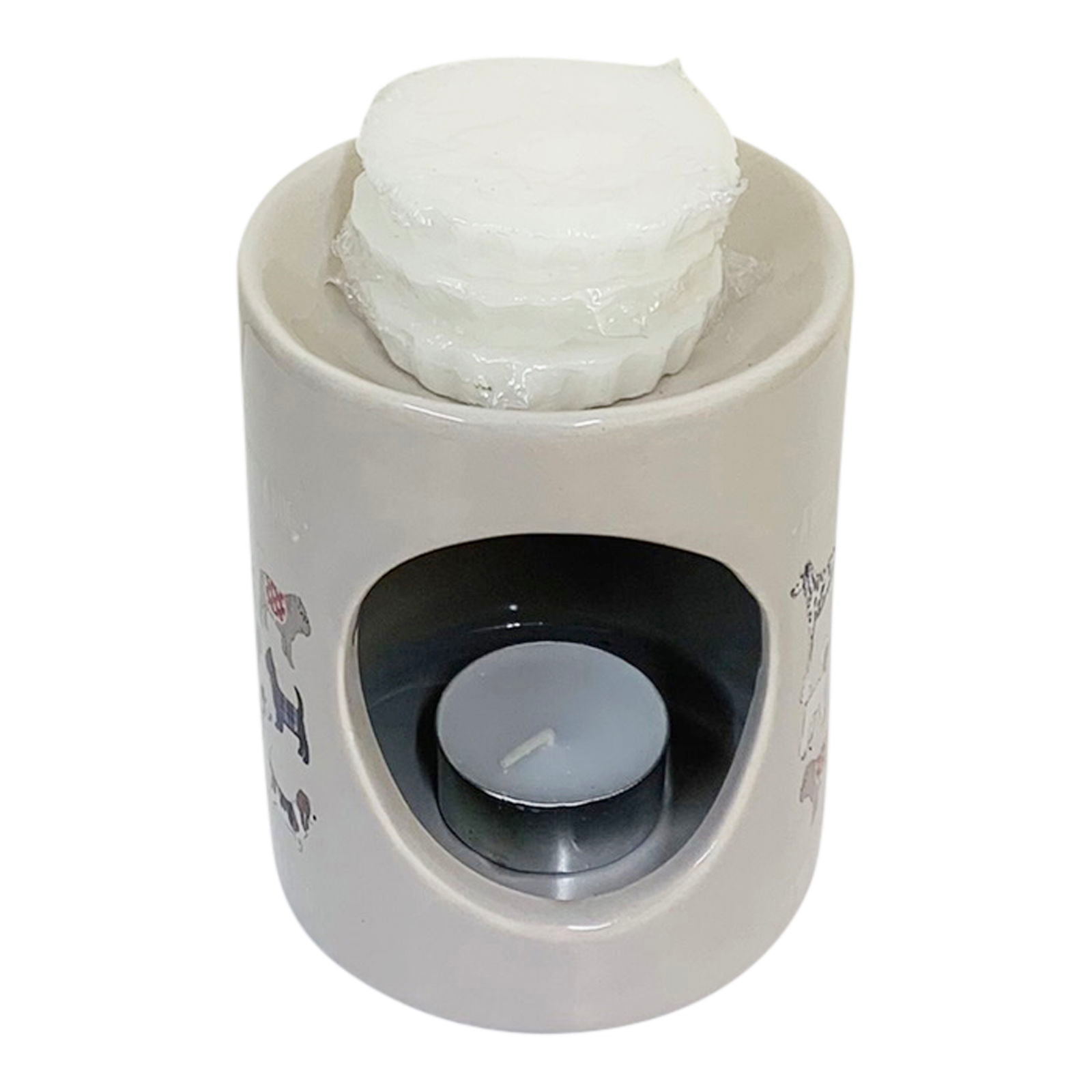 This dog designed oil burner would be a great gift to a dog lover. The simple design of the this burner means it would be perfect on display on a sideboard or bookshelf. This oil burner is also supplied with one tealight and three wax melts all wrapped together in cellophane with a ribbon bow. An oil burner in dog design that comes with one tea light and three wax melts. The overall measurements are: D17 x H9 x W9cm SKU: PG0102
