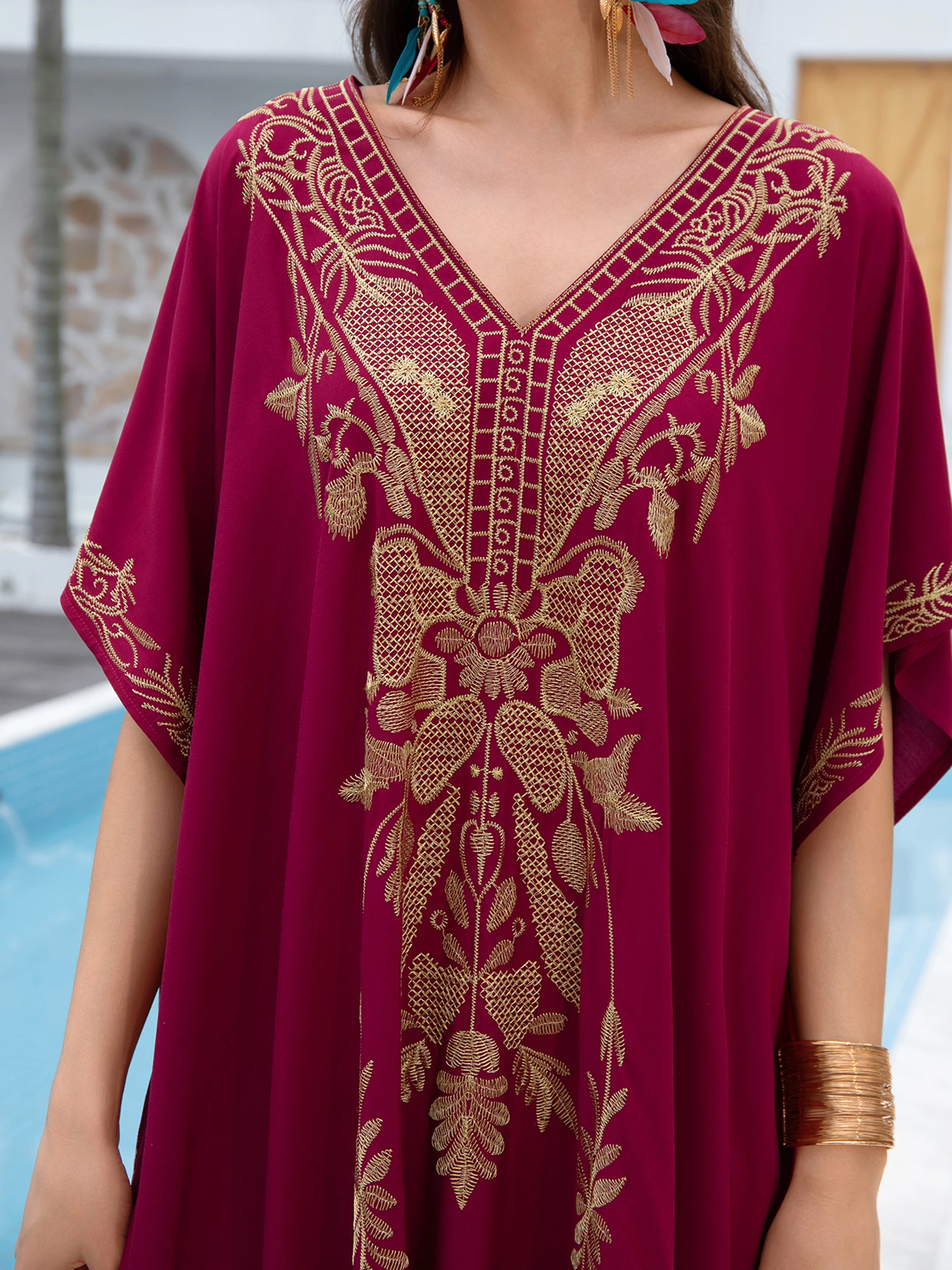 Sexy V-neck Gold Embroidery Long Beach Dress Women's Red Vintage Kaftan Loose Beachwear Vacation Swimsuit Bikini Cover-ups Q1702