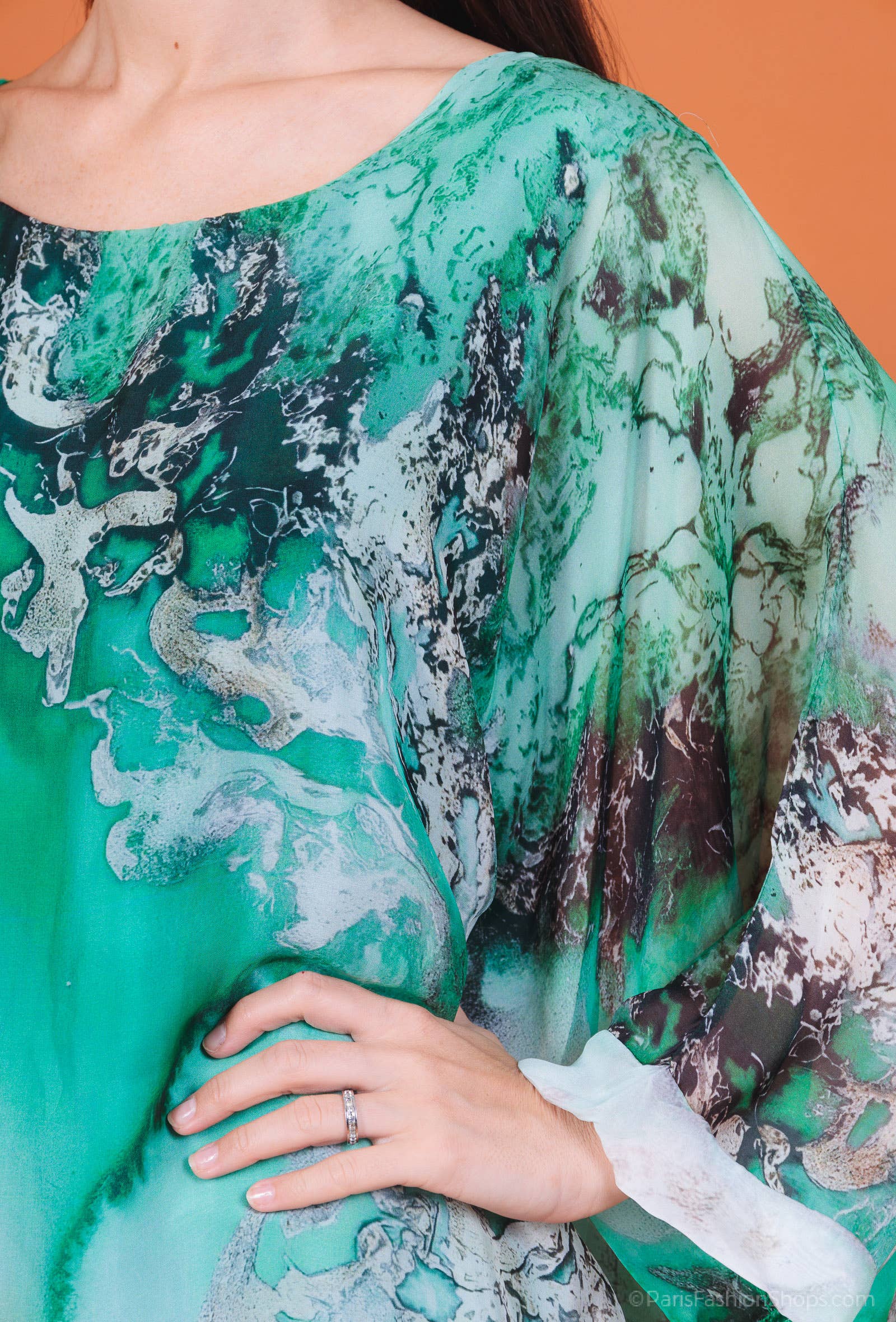 This fluid silk top features an asymmetrical design adorned with delicate floral embroidery, offering a refined and artistic touch. Its mid-length sleeves enhance versatility, making it suitable for both elegant daytime and evening wear. Crafted from luxurious silk, it delivers exceptional comfort and a graceful drape.