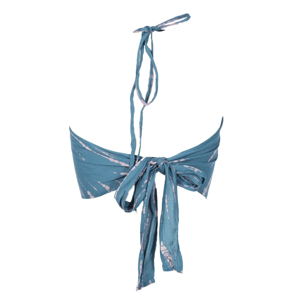 The world wouldn't be anywhere near as colourful without tie dye! This lovely little top celebrates the magic of tie dye in a subtle way with its snakeskin-like patterns. A sweet cropped backless halter neck top, the style is simplicity itself with ties at the back and around the neck. Available in petrol, black, blue, green, grey and white, it's an easy-going wear with your jeans or harems and goes just as well with a flowing long skirt or short hippy skirt.