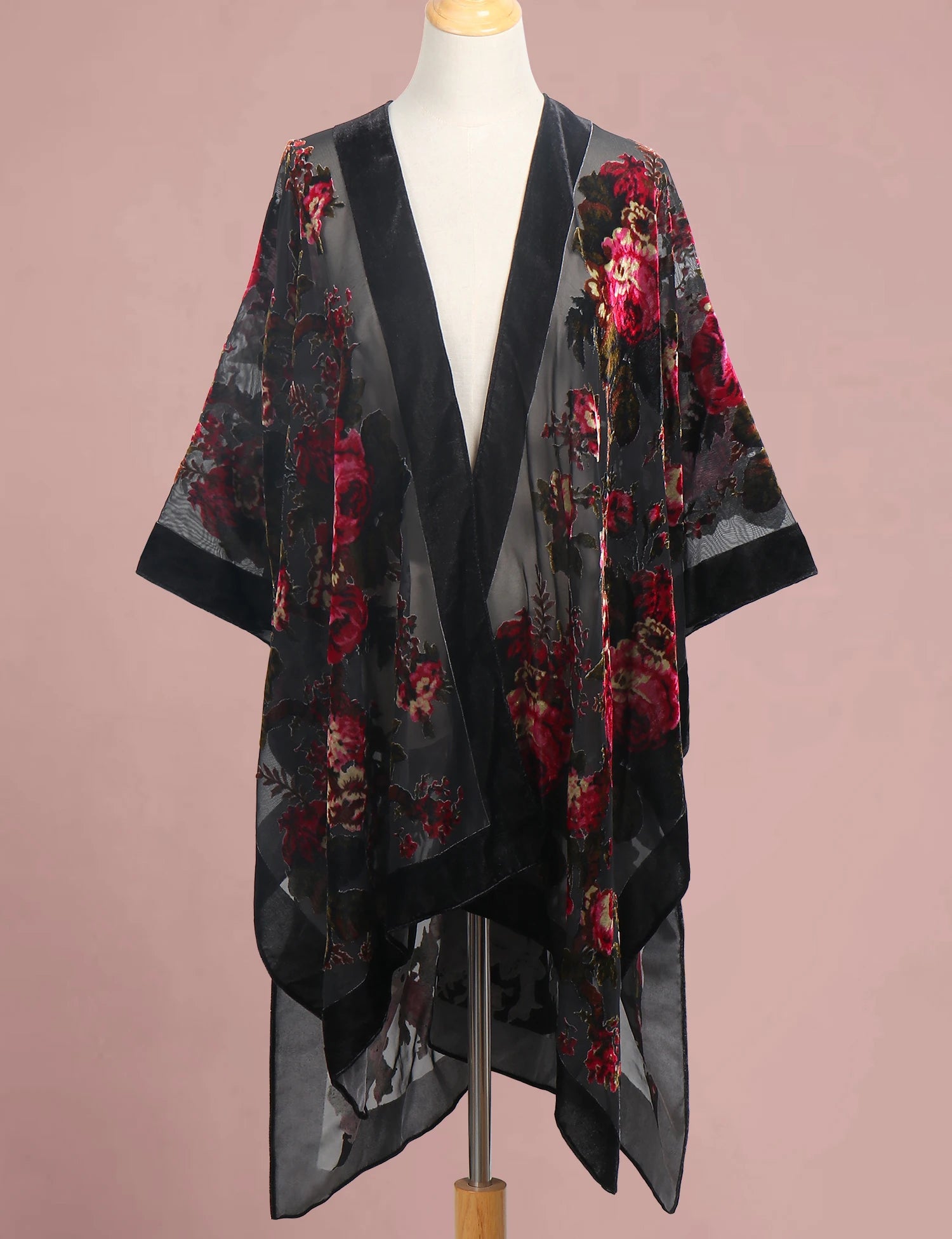 WeHello Bohemian Women's Burnout Velvet Kimono Long Cardigan With Beach Coverup Luxury Holiday Cardigan Shawl Tassel Chiffon