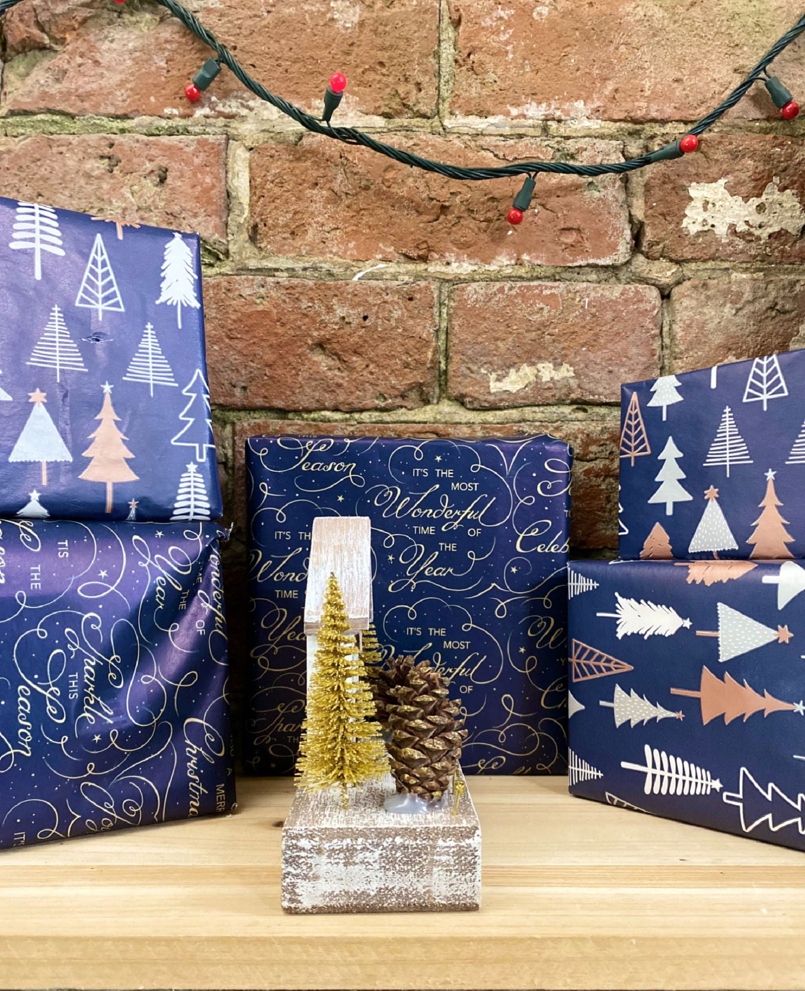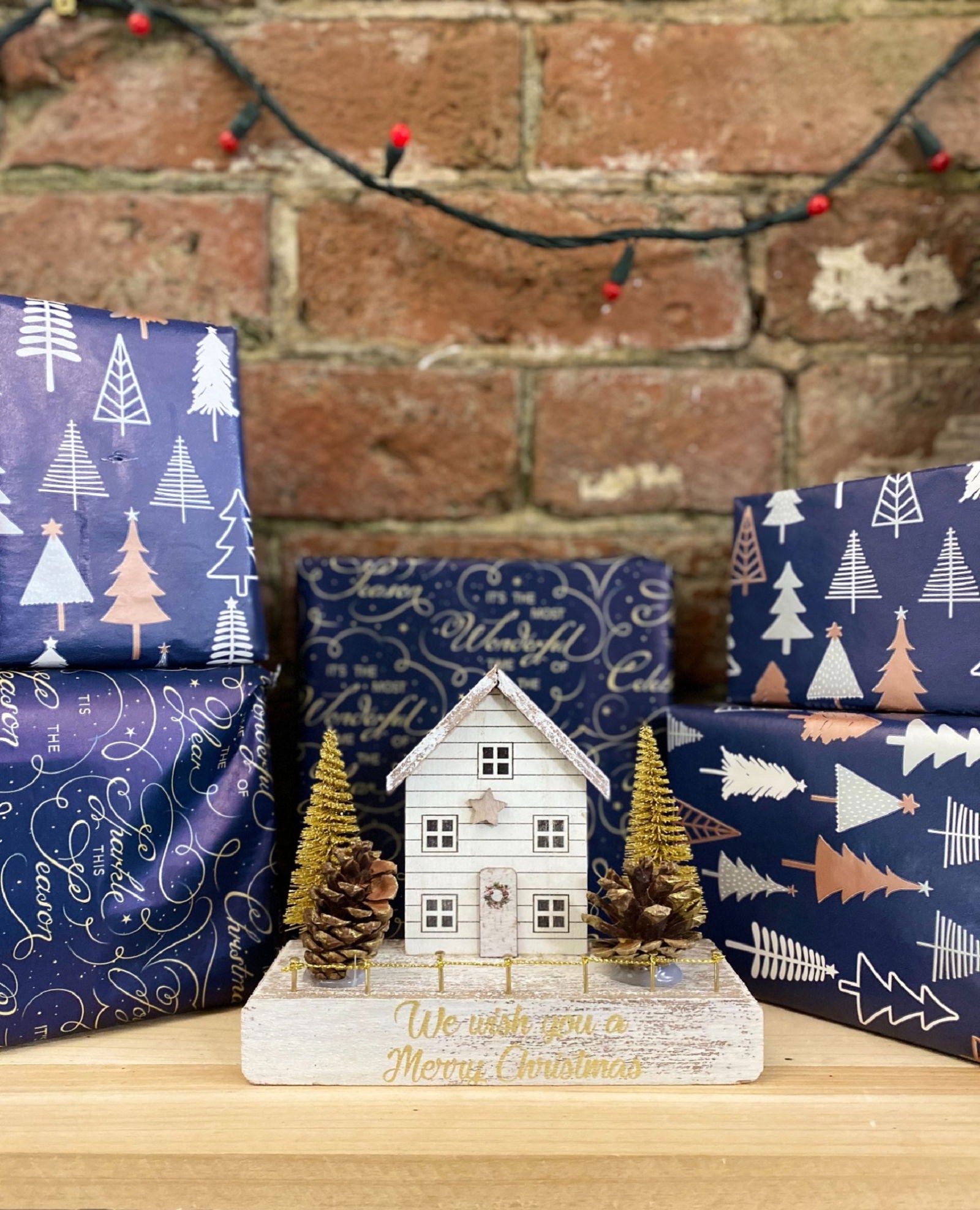 A festive wooden house table decoration with gold Christmas trees and a message. A festive piece depicting a Christmas scene, made in wood on a rectangular base which measures 15x6cm. There is a 'We wish you a Merry Christmas' message in gold inscribed on the base, with a house set between two gold fir trees. A decorative ornament to bring Christmas cheer into any home. Overall measurements: D6 x H12 x W15cm