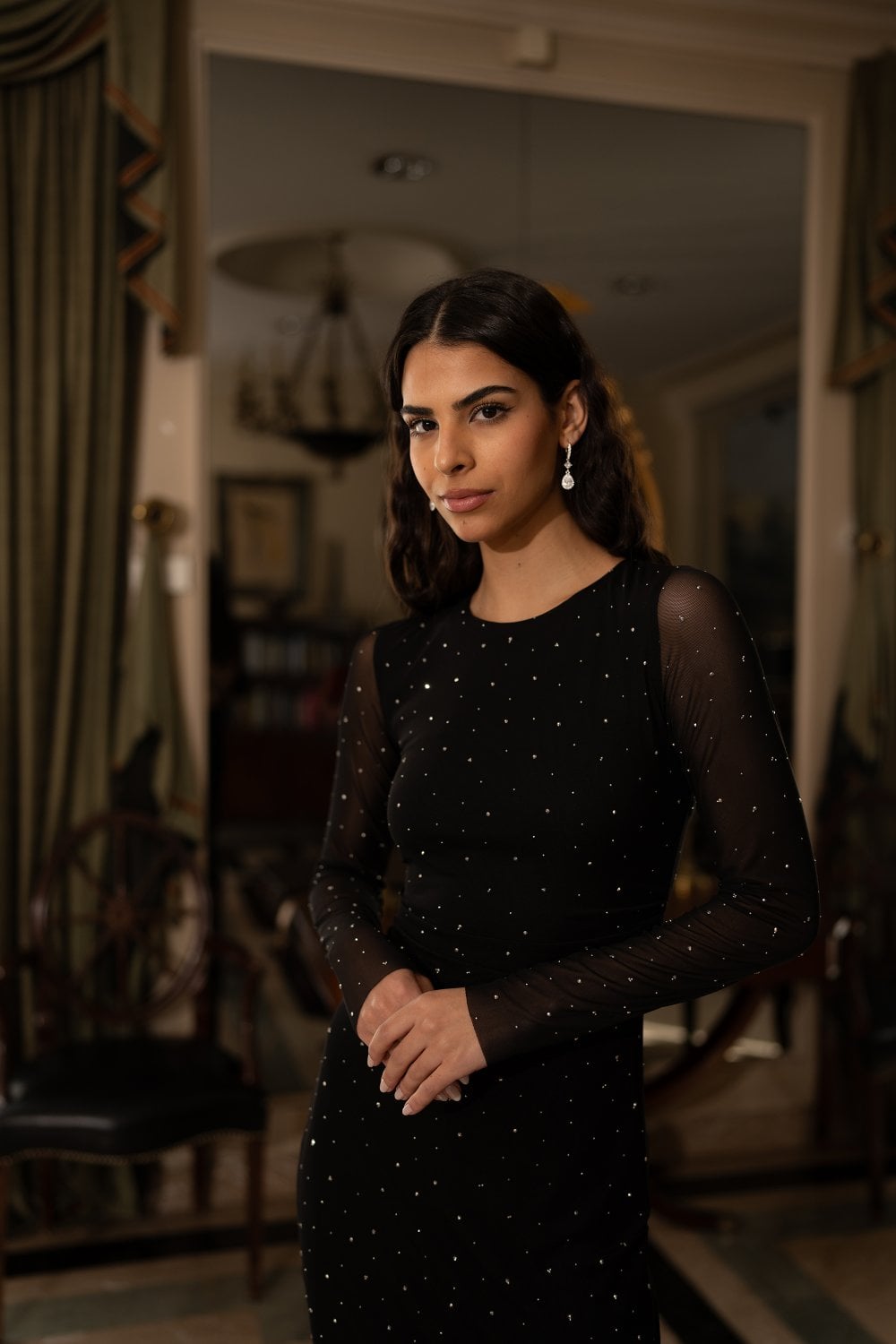 Looking for an absolute slay show stopper for party season? Look no further! This bodycon mesh dress features a cut out back with tie fastening, all over diamante studs and midi length. Elegant and seductive for a head turning fit this season!