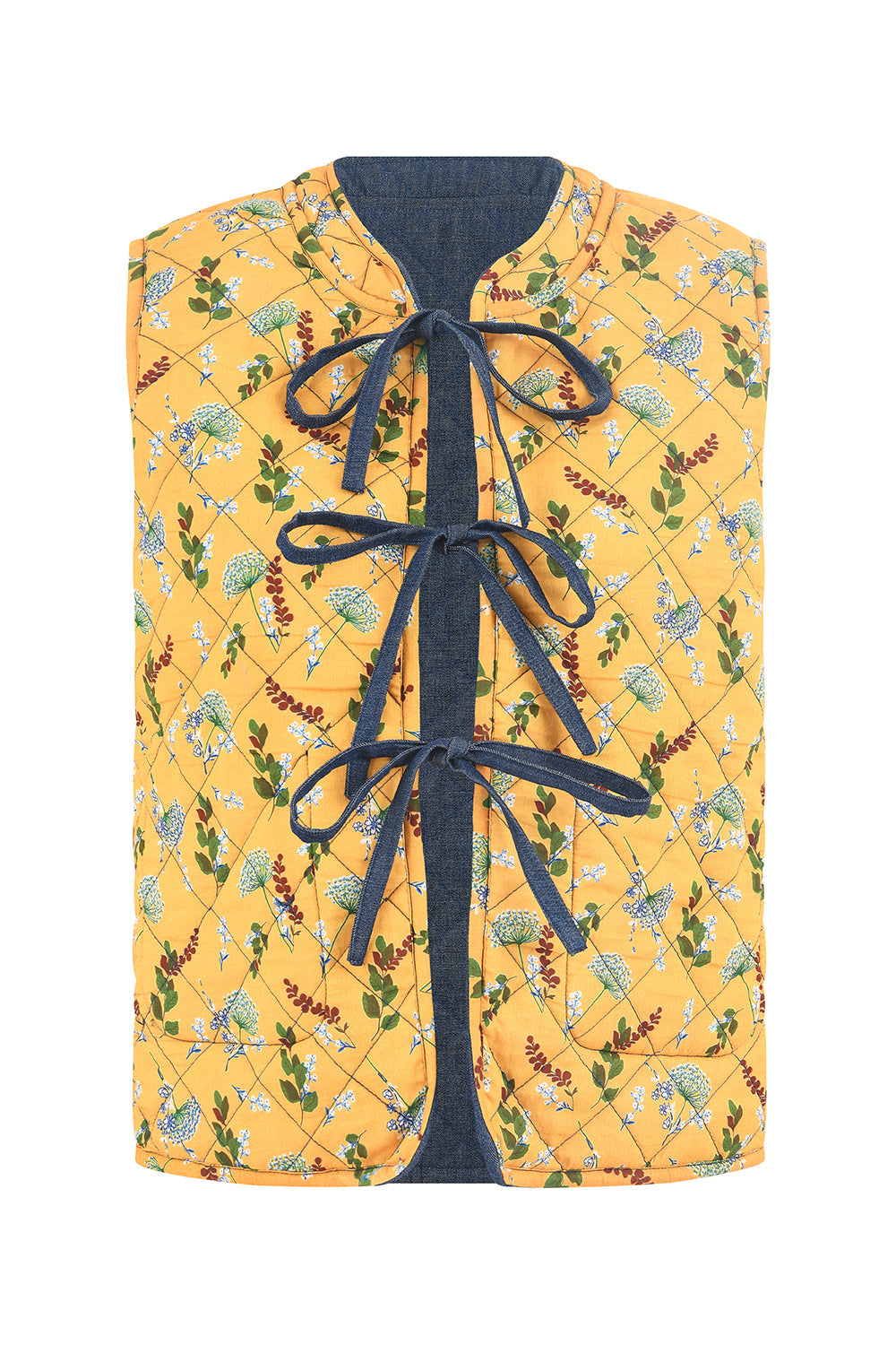 This versatile vest, made using traditional quilting techniques will; bring some sunshine into your wardrobe - With a chambray denim styled that can be reversed to show off the bright and colourful floral lining. With a tie front and pockets - We love this for the changing seasons.
