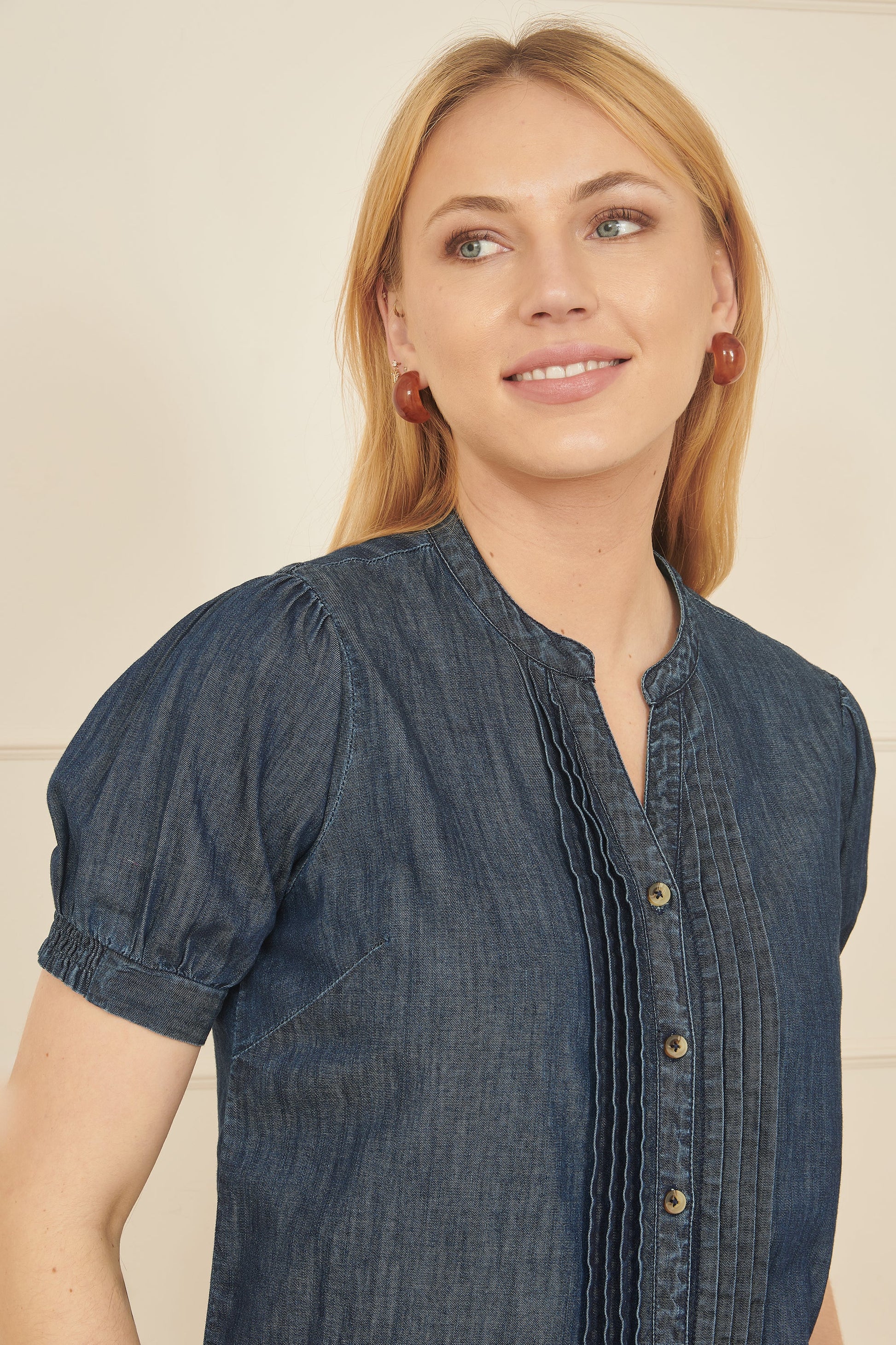 This cute little shirt will be perfect for spring days. Made from a lightweight cotton chambray denim that looks great styled with wide leg trousers. The puffed sleeves are cute, with a button up design embellished with a pleated down the front.