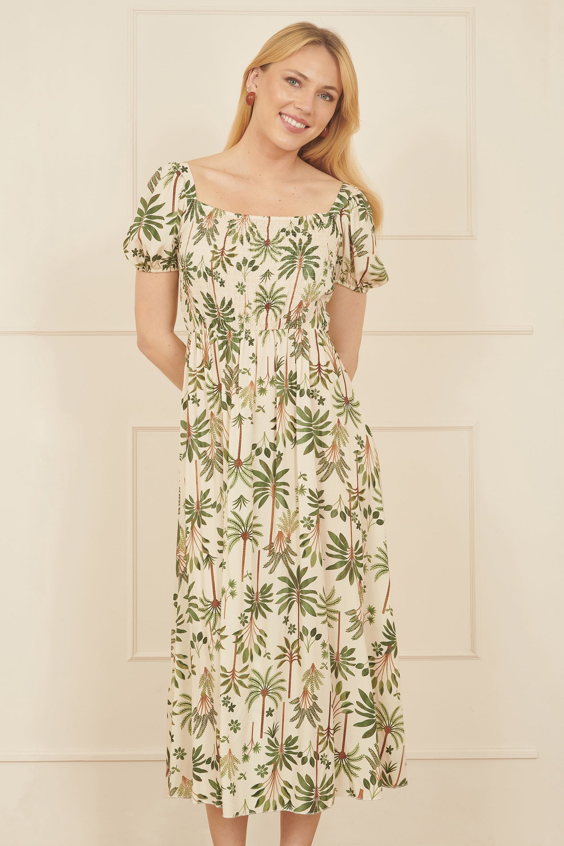 In a gorgeous all over Palm print and made from a lightweight cotton this is perfect for tropical getaways, The ruched bodice is super flattering and comfortable, with cute puffed sleeves and a square neckline. The midi length makes this perfect to wear with sandals or trainers for everyday.
