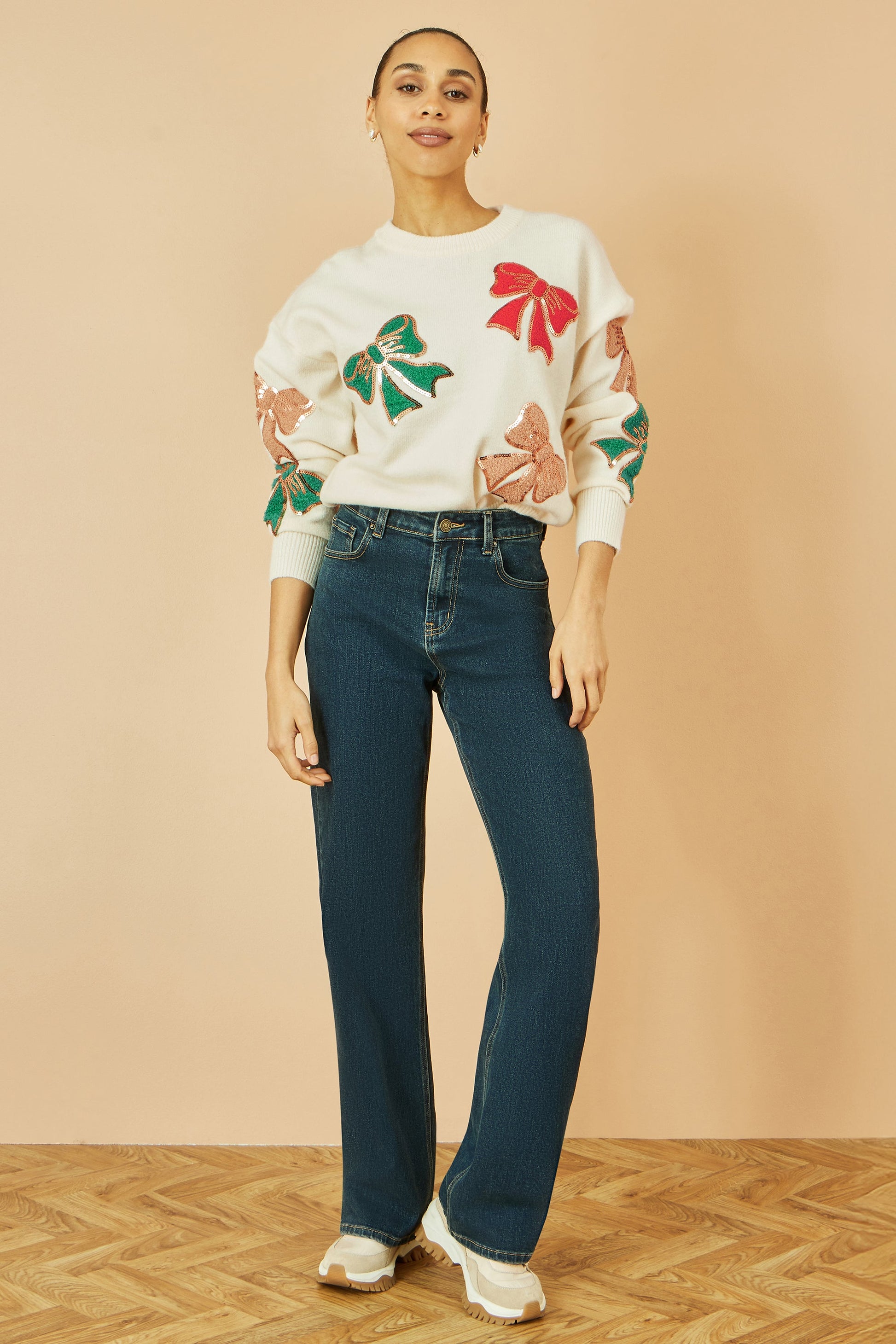 Get ready to celebrate the Christmas festivities in this season's cutest trend - Bows! The relaxed fit knitted jumper is soft and cosy, and adorned with gorgeous oversize sequined bows in festive colours.